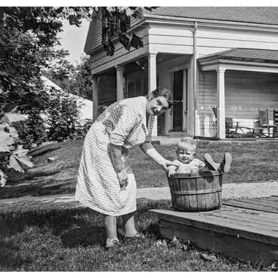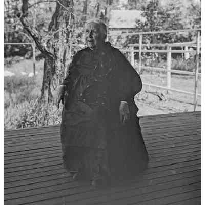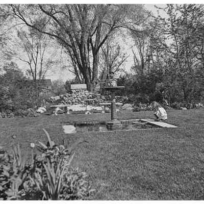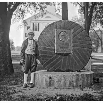 Mrs. Doane by well pump at Mabel Damon’s, Old Sudbury Road