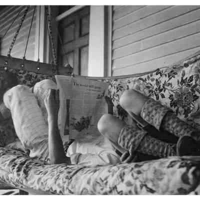 2 people reading on porch hammock