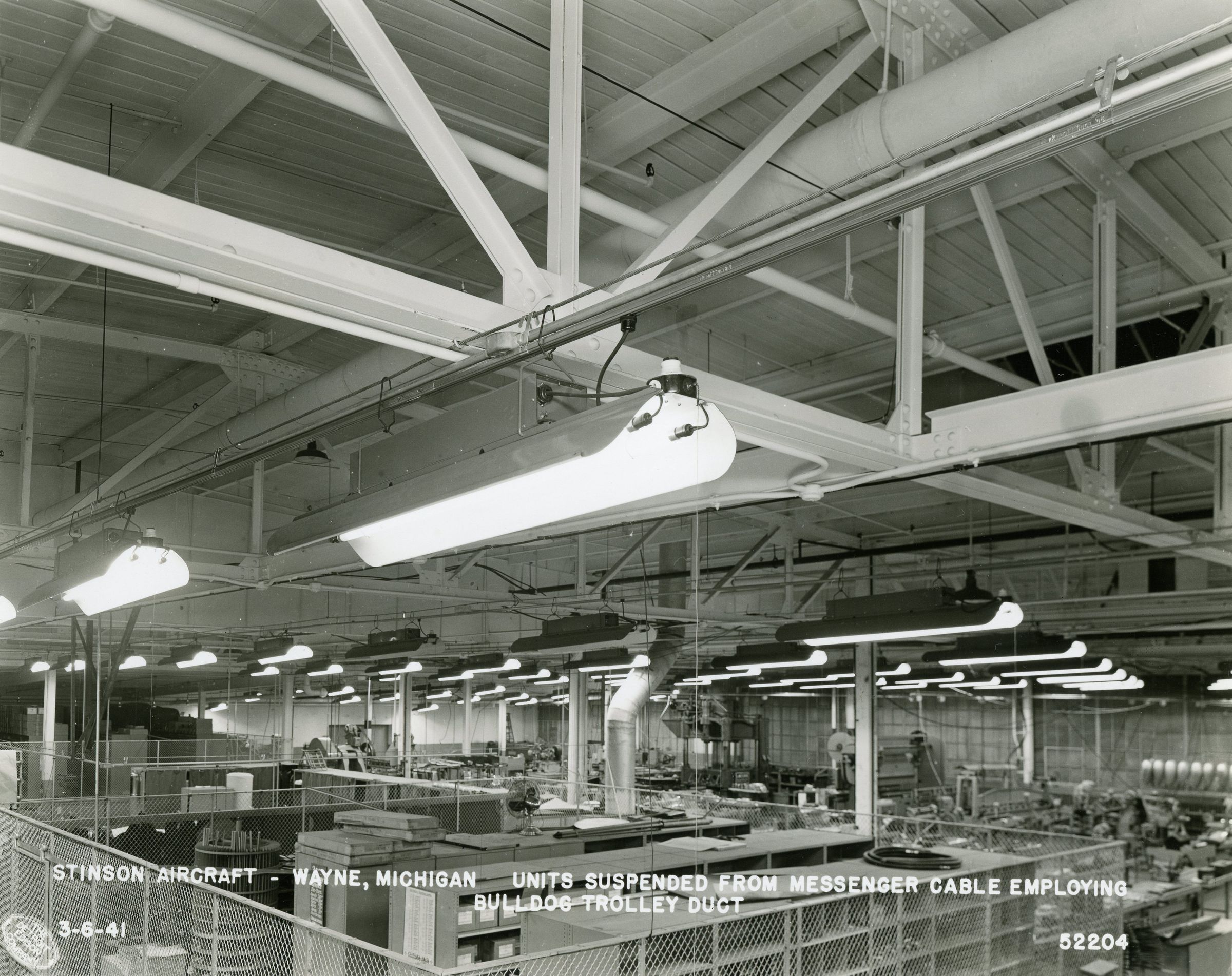 Inside the Stinson Aircraft Factory at Wayne, Michigan. Units suspended from messenger cable employing bulldog trolley duct. The Stinson Aircraft Factory was in the Detroit-Wayne Industrial Airport. The property followed Van Born, Ecorse, Cogswell and the Pere-Marquette railroad.Cataloged By
