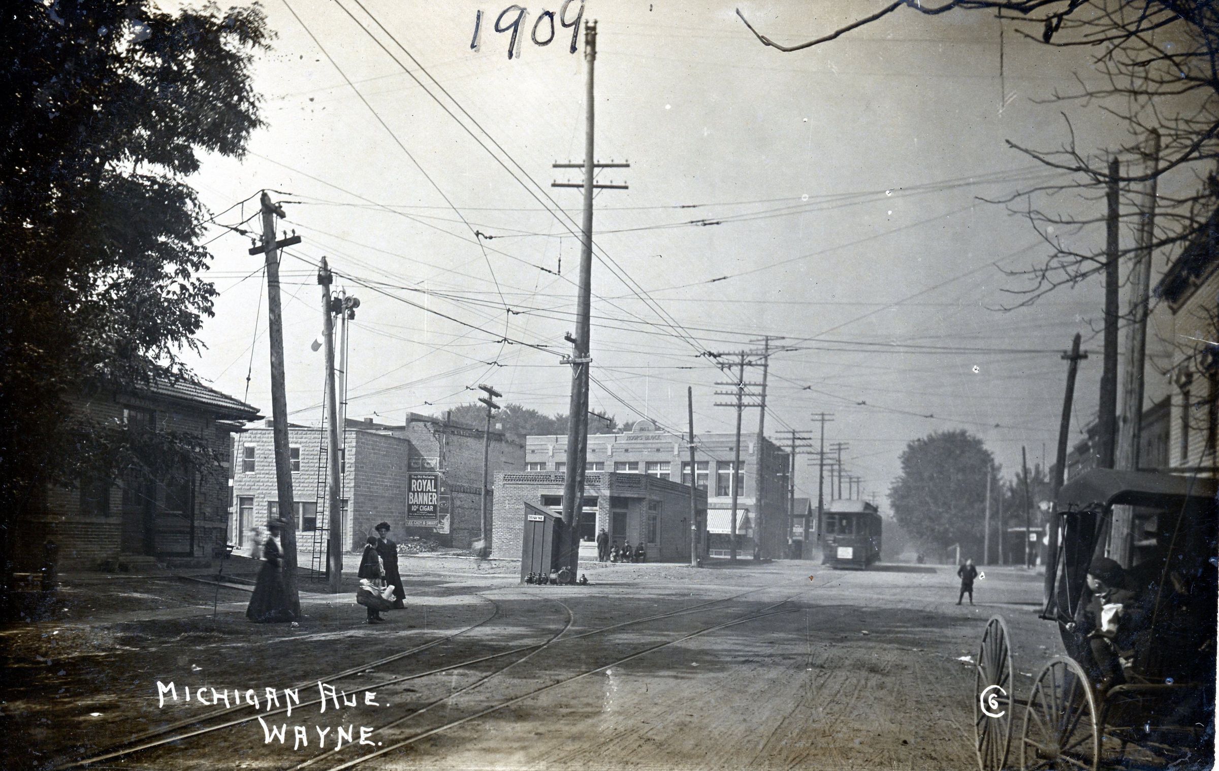 Michigan at Wayne road looking SW from the east side of Wayne road. DUR streetcar station on left, Wayne road at corner. Hoops Block in distance on Monroe street. Horse and buggy visible at right. c. 1909Cataloged By
