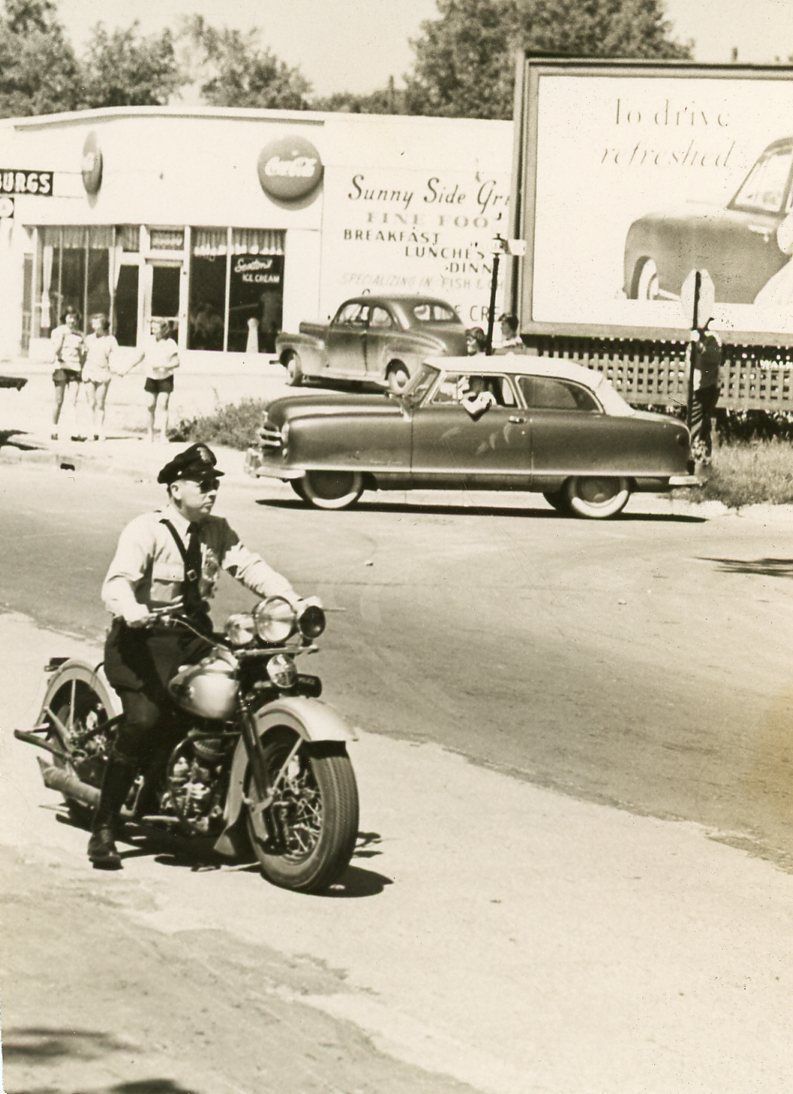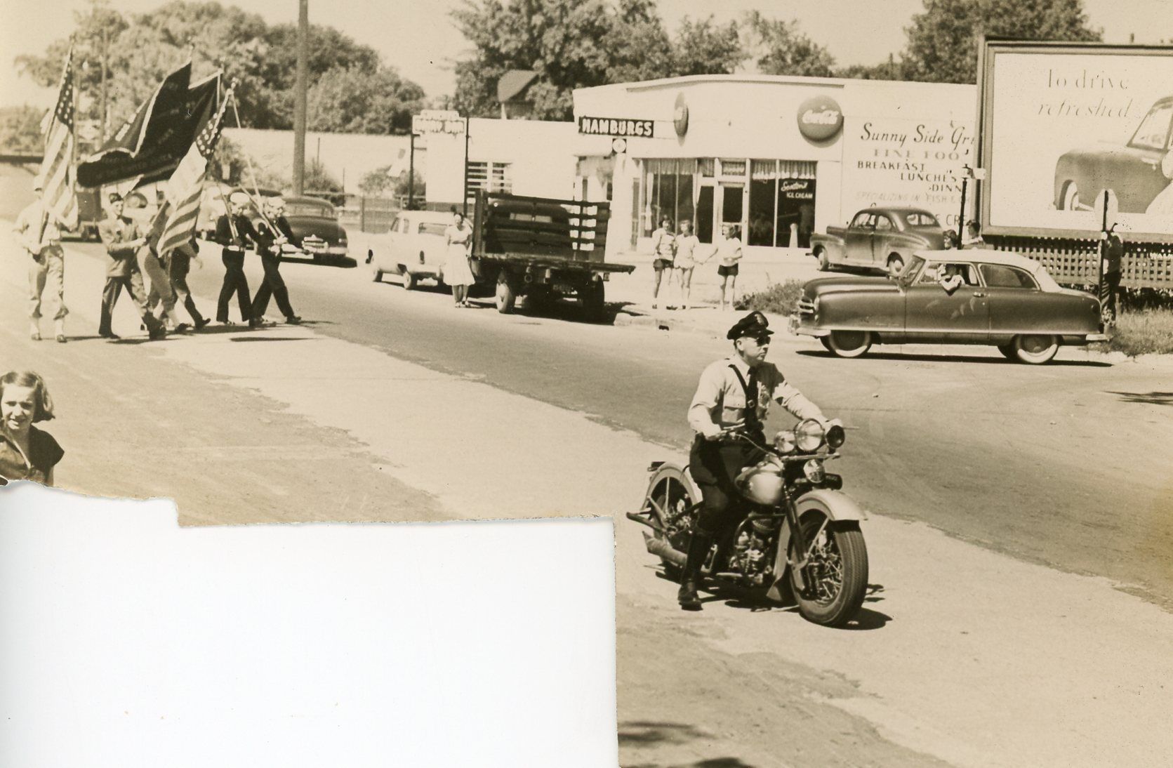 A Wayne patrolman leads the Memorial Day Parade east on Mich Ave from Williams St. in the 1950's. 35830 Michigan Avenue in Background, Sunny Side Grill.