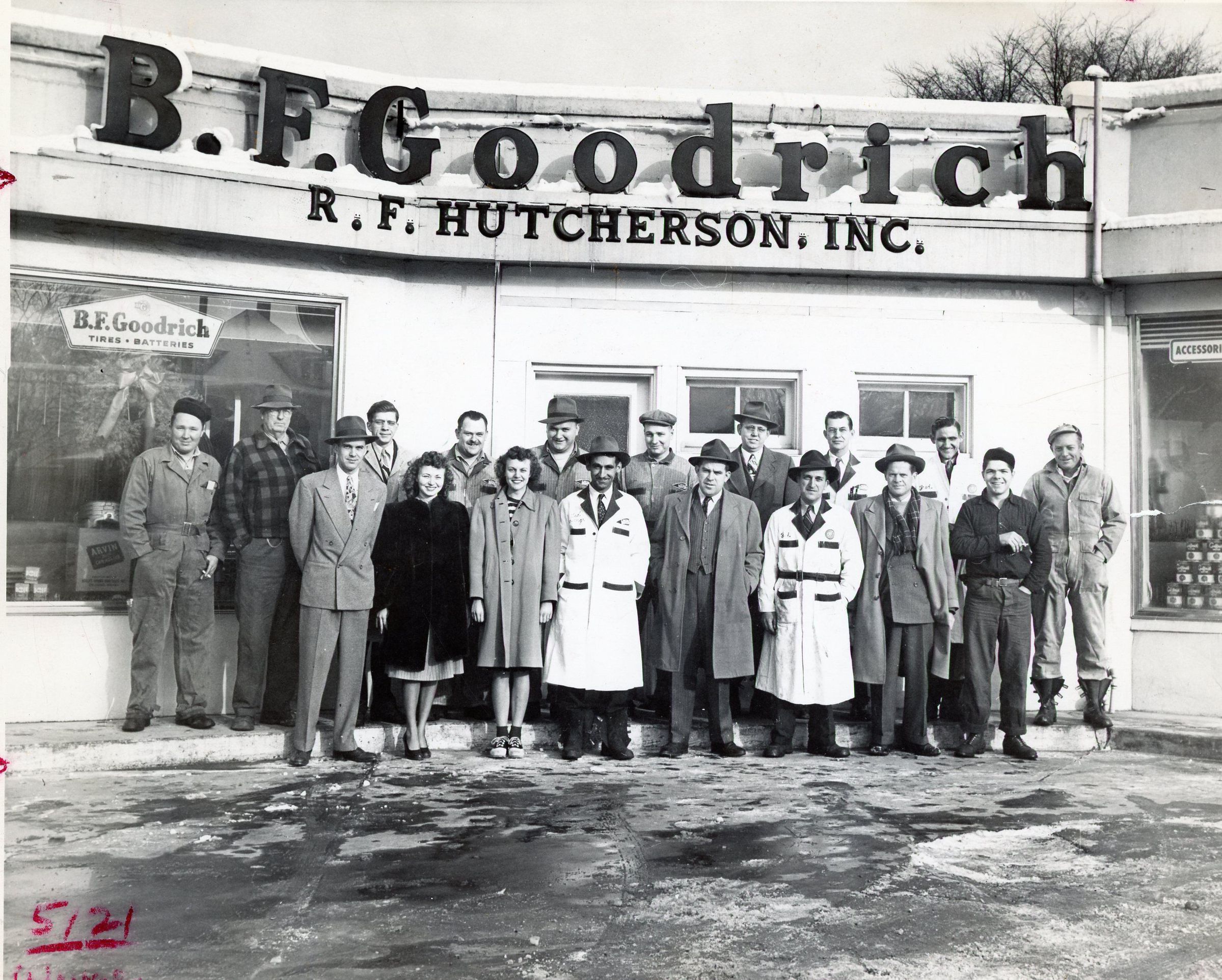 Employees of R. F. Hutcherson Inc on North West Corner of MI Ave and Elizabeth. Hutcherson moved to this location in 1946. B.F. Goodrich station. Wayne Eagle photo.Cataloged By