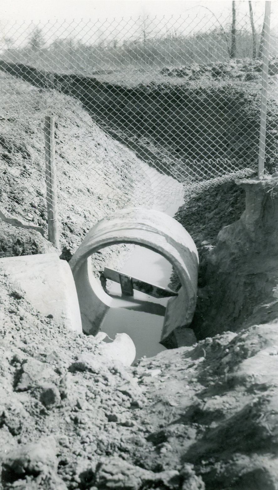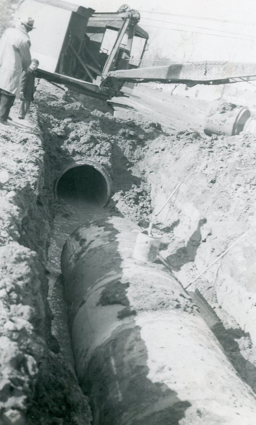 Relaying 48" of sewer pipe on Hannan Rd. Ivan Oliver is doing the work on Oct. 25,1949.