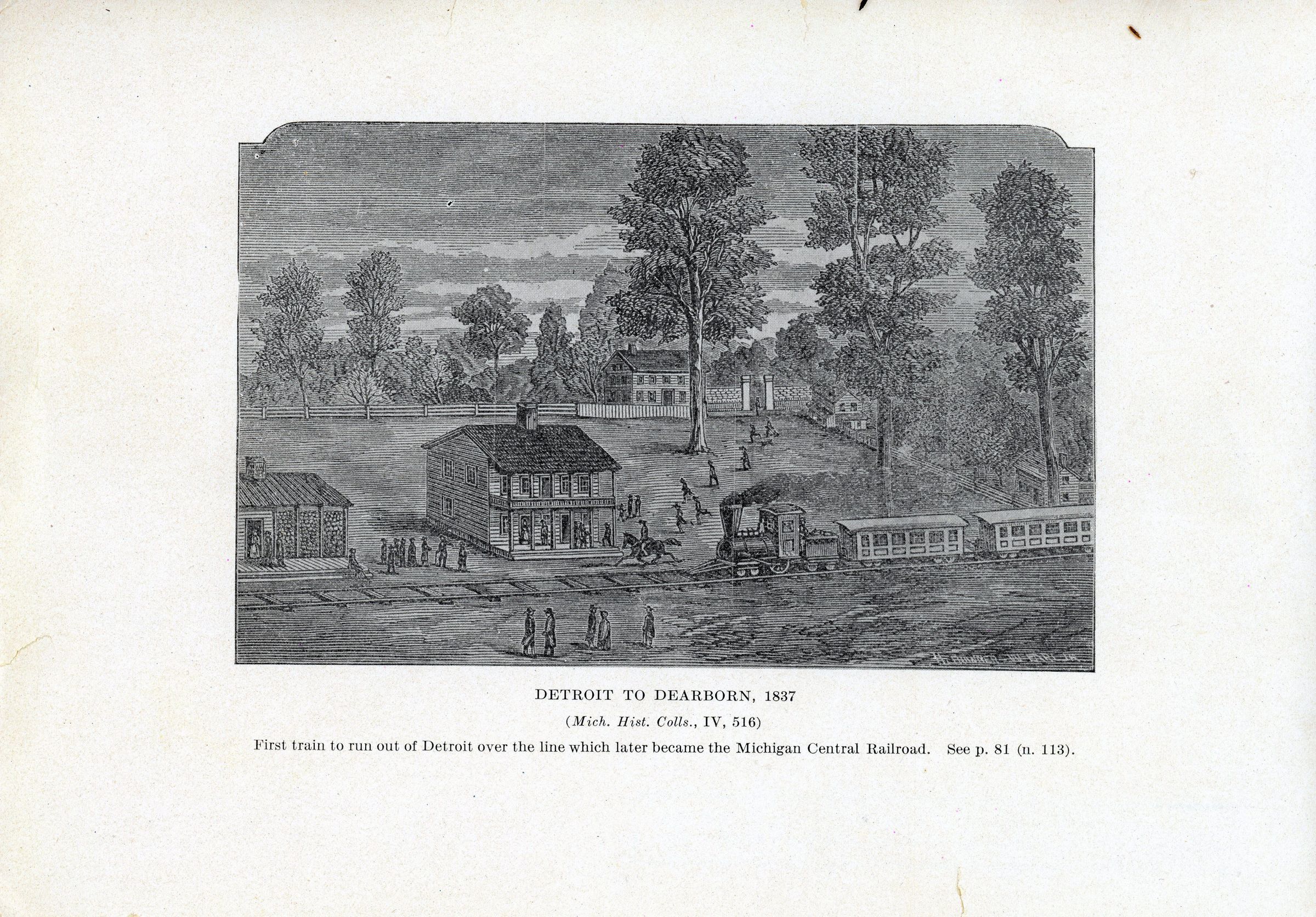 First train to Dearborn 1837. Drawing from "The Bark Covered House"