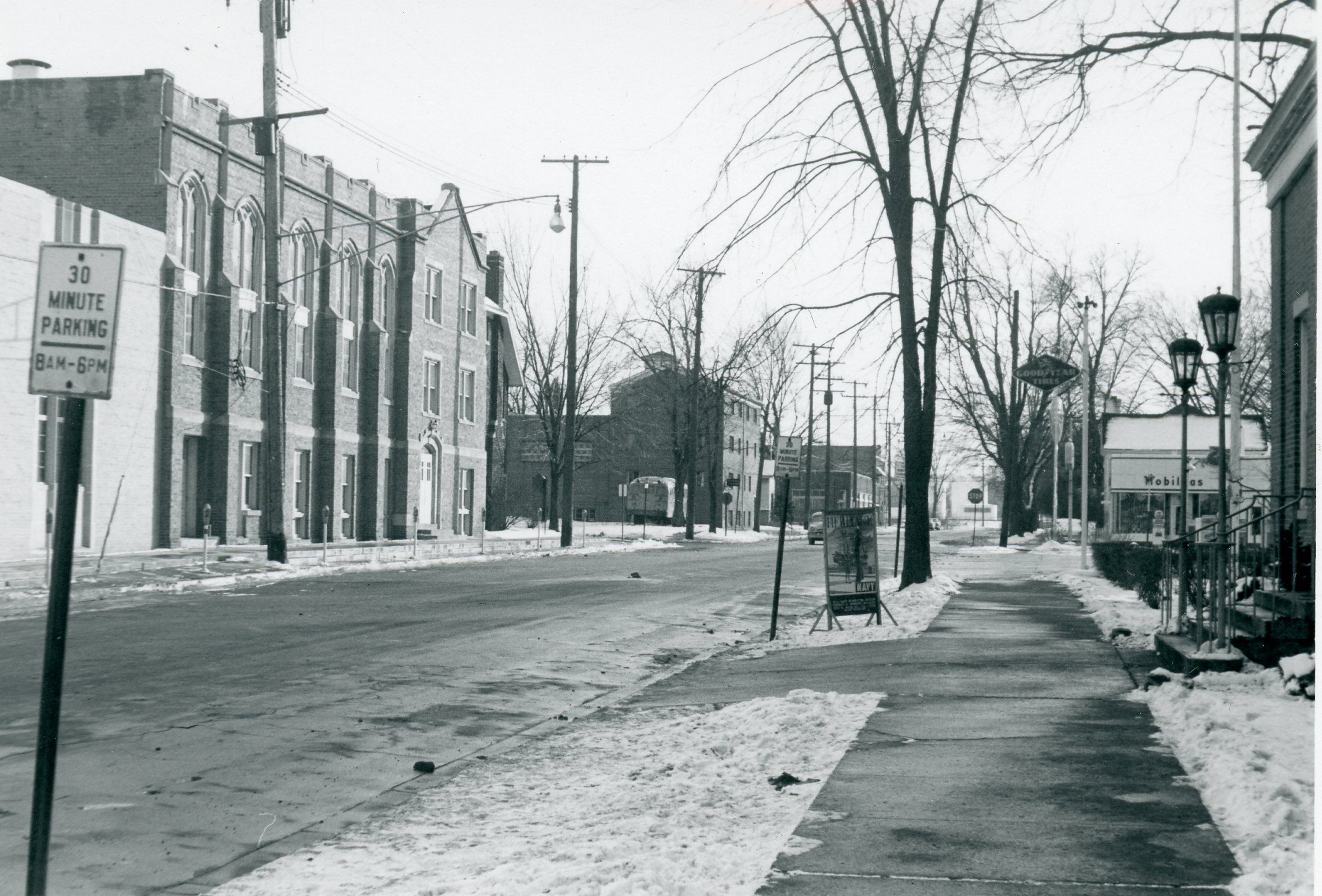 Newberry looking South from Park street. Methodist church on left, post office on right.