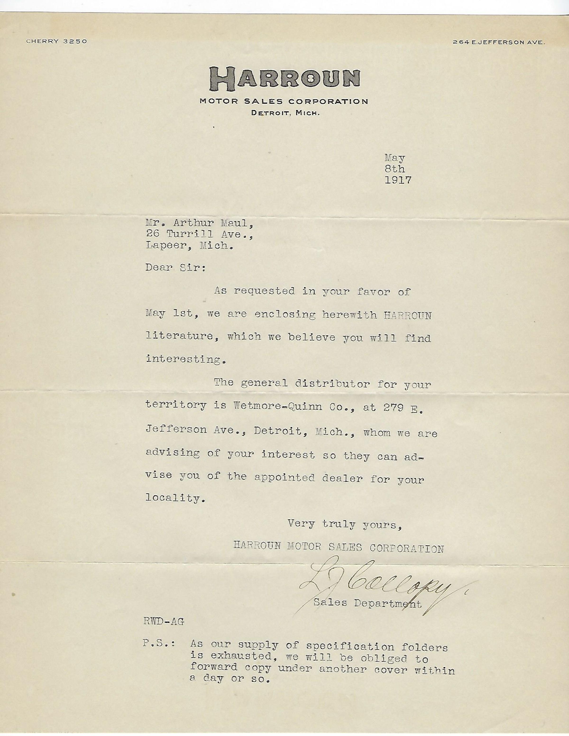 Request for Harroun Literature 1917
