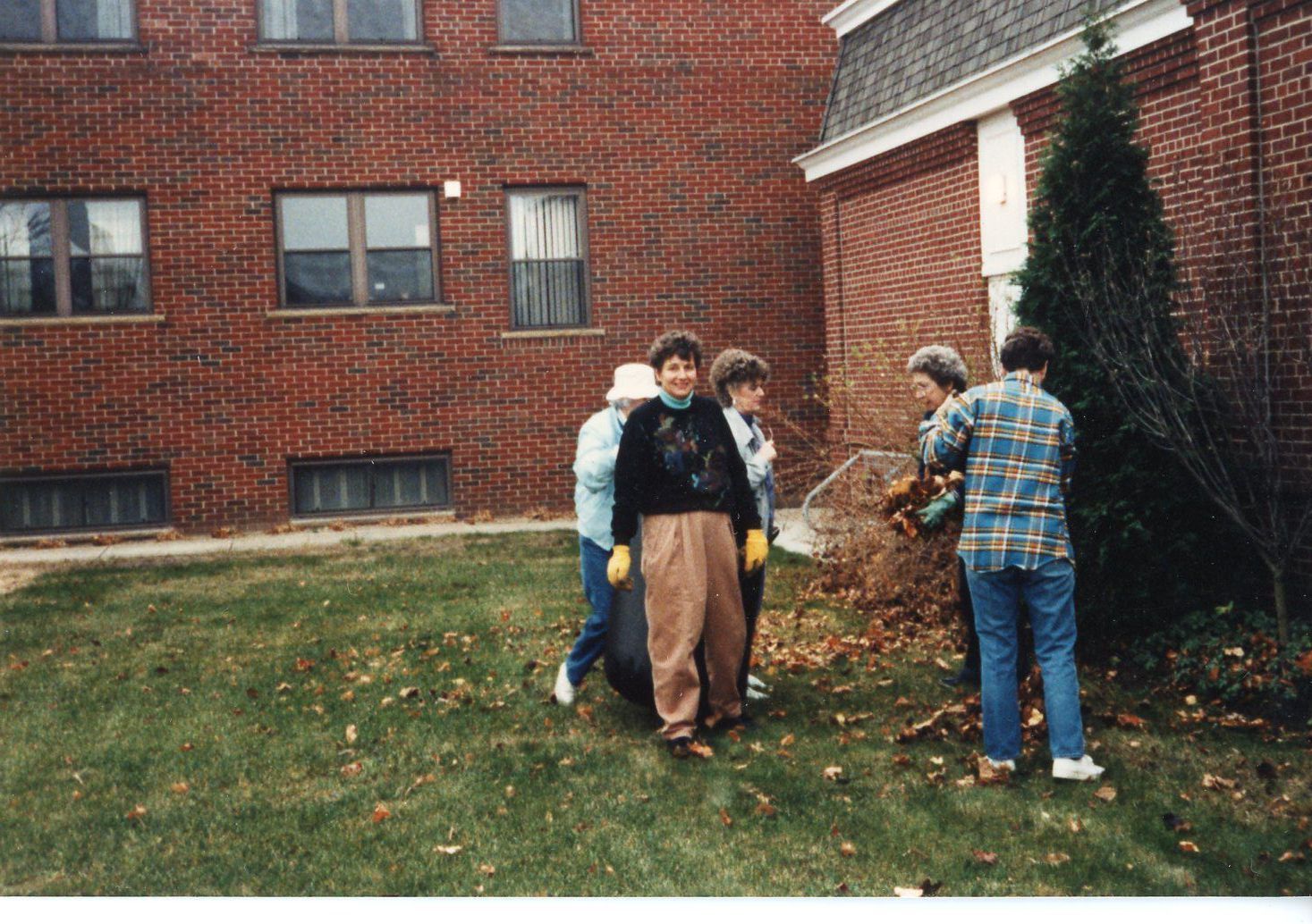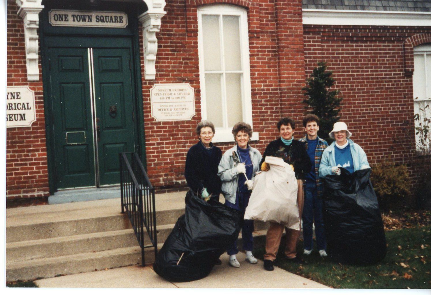 Garden Club cleaning flower beds on Monday, November 19, 1990. Left to Right: Lola Prieskorn, Sharon Arthur, Ginny Attwood, Bettie Grimes and Hallie Francis.Cataloged By
