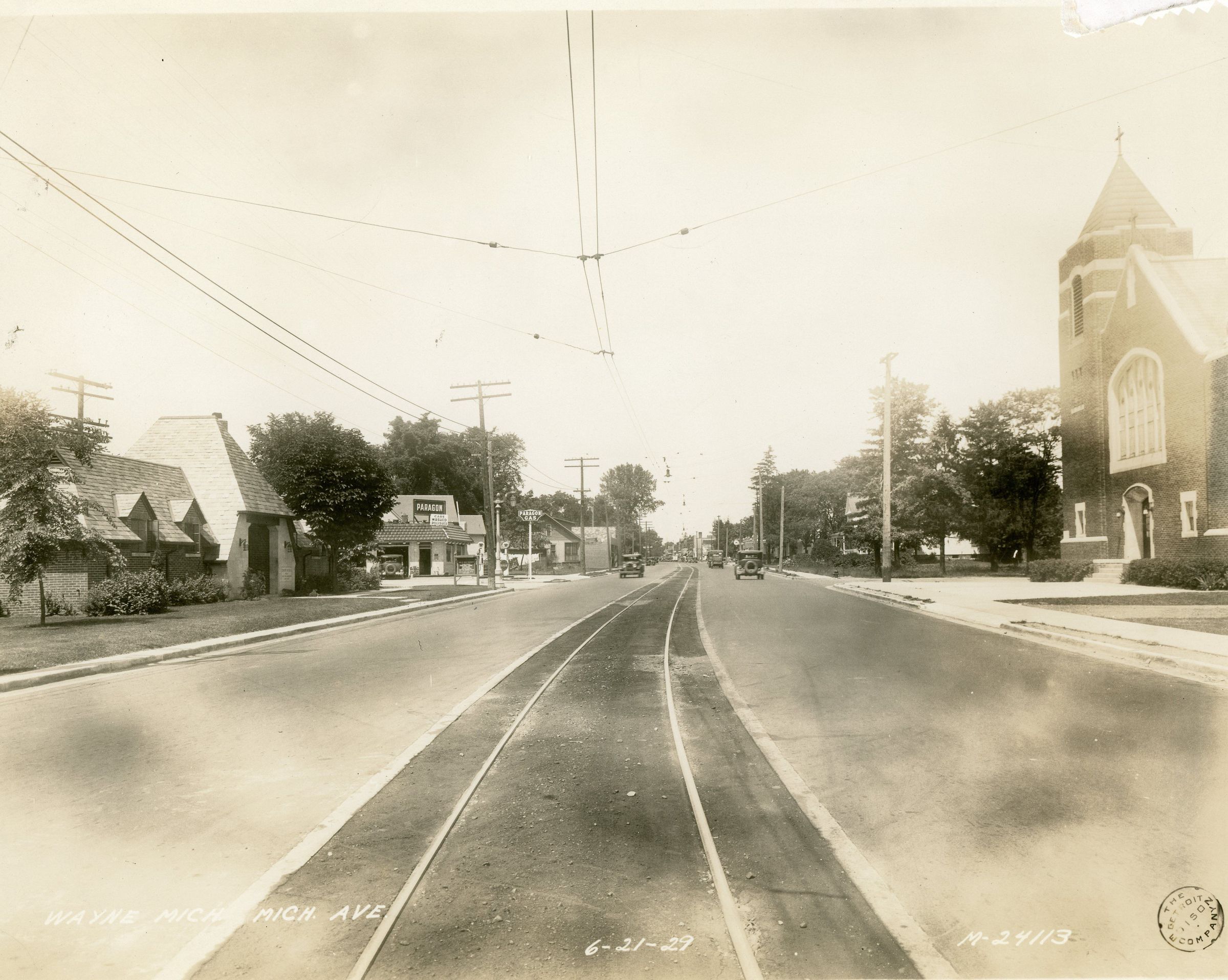 Michigan Avenue looking West from St. Marys, between 3rd and 4th street. Comfort station at left, Paragon gas station, St. Marys Church on right. c. 6-21-1929.Cataloged By