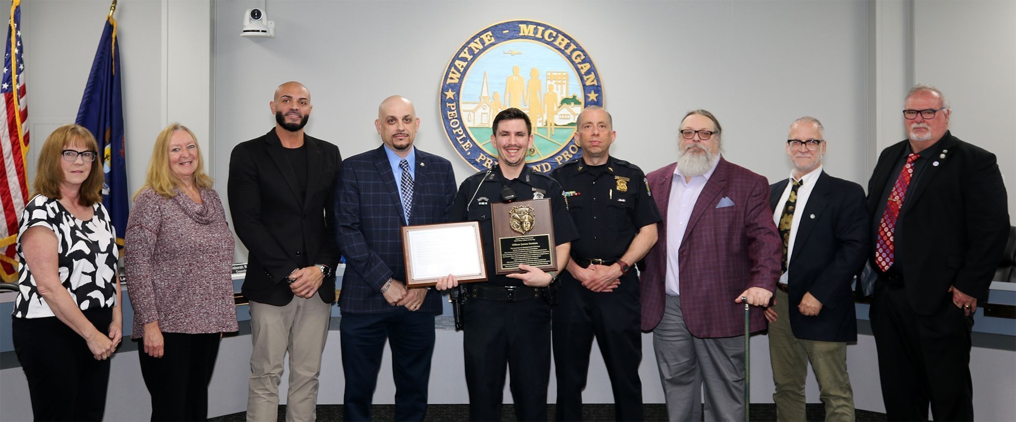 Pictured with City Councilwoman Lawrence, Councilwoman Wass, Councilman Darwiche, Mayor Rhaesa, Police Chief Strong, Councilman Dowd, Mayor Pro Tem Brock, and Councilman Quarles.Cataloged By