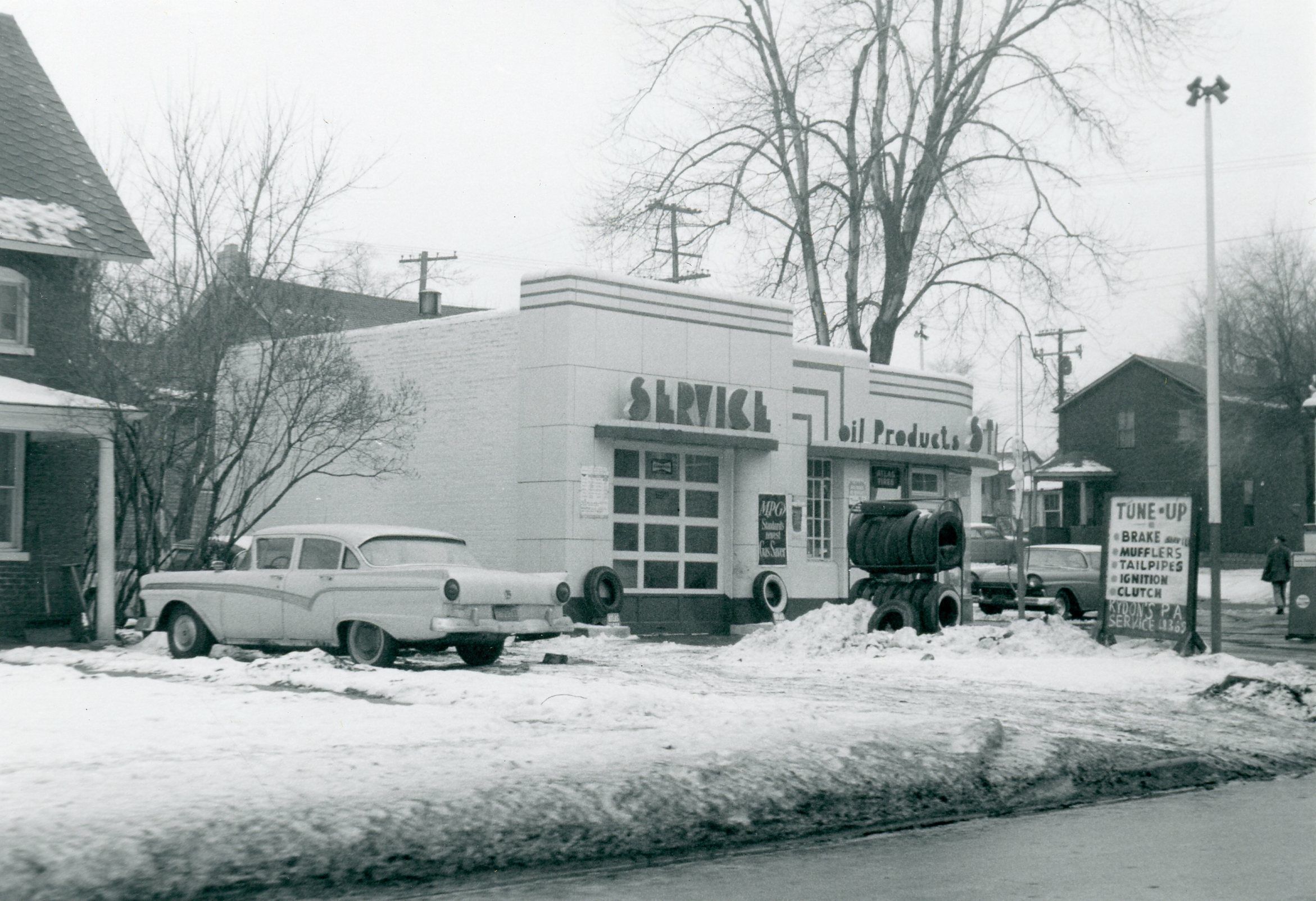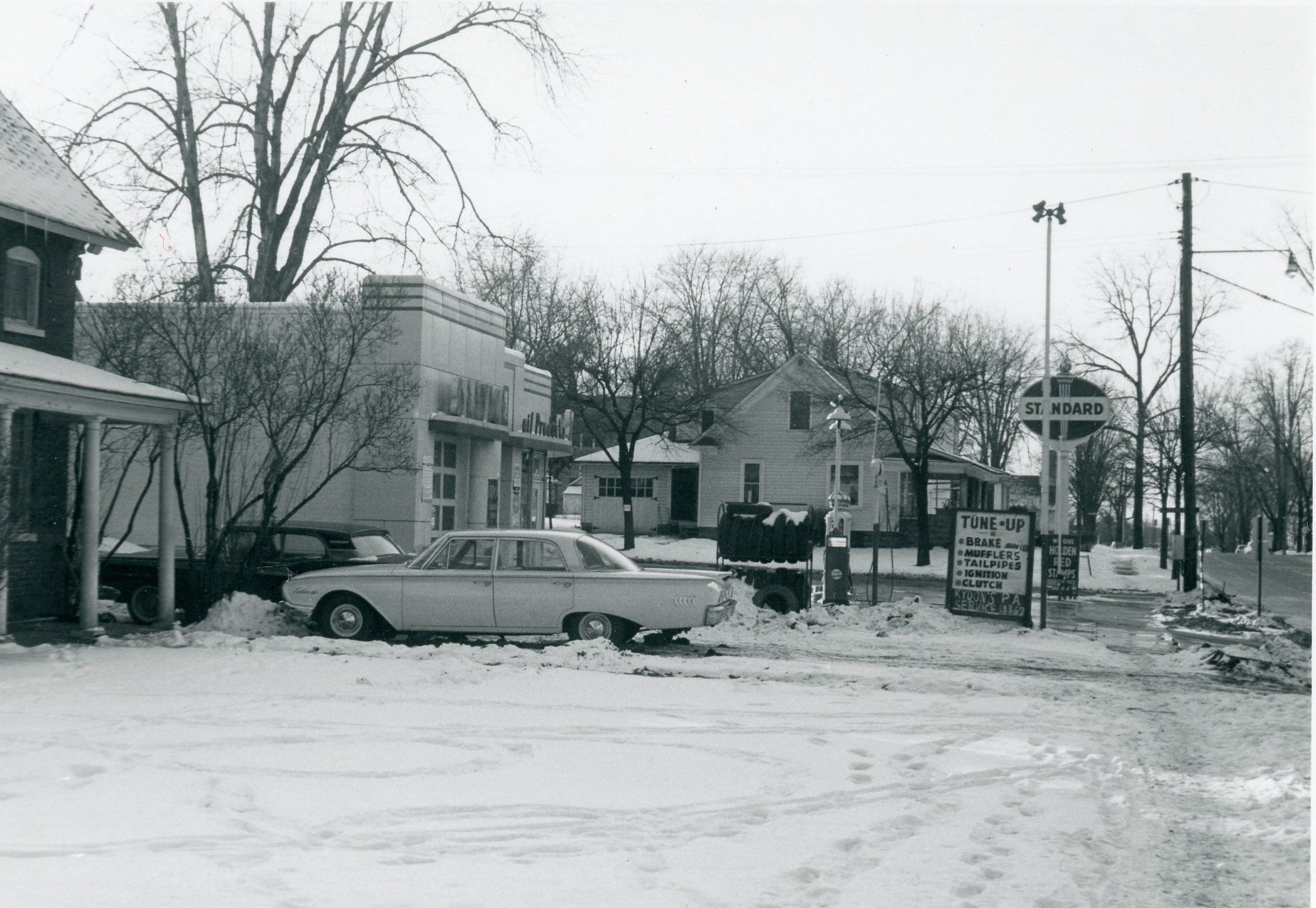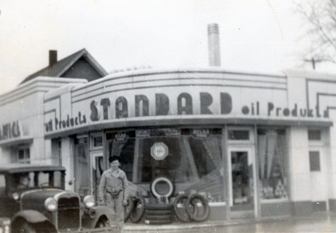 35447 Main. Standard on SE corner of Main and Elizabeth St with Tramp Arthur standing in front. Tamp Arthur ran station. Picture taken aprox. 1935.Cataloged By