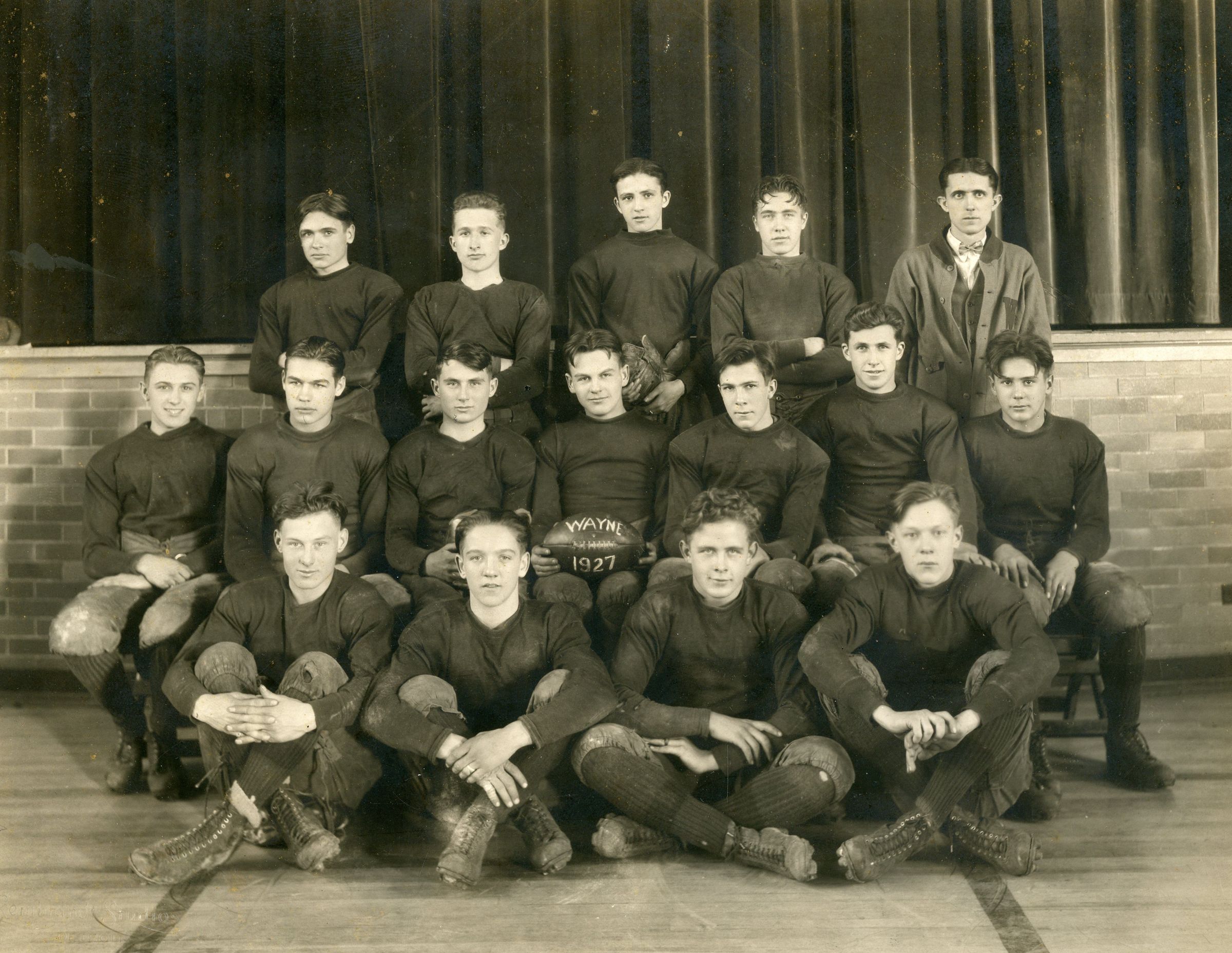Wayne High School Football Team 1927. Back Row: Robert (Bob) Rowlson, Frank Huffley, "Dizz" Mohon, "Robbie" Hugbie, Coach C.R. Fuller. Middle Row: Bernard Tykoski, Ed Yester, Bernard Bird, Cy Glover, Jim Freeman, Weldon Emerson, George Zoumbaris. Front Row: Ellis Bird, George R. WAD, Cliff Tyler, Richard Janner.Cataloged By