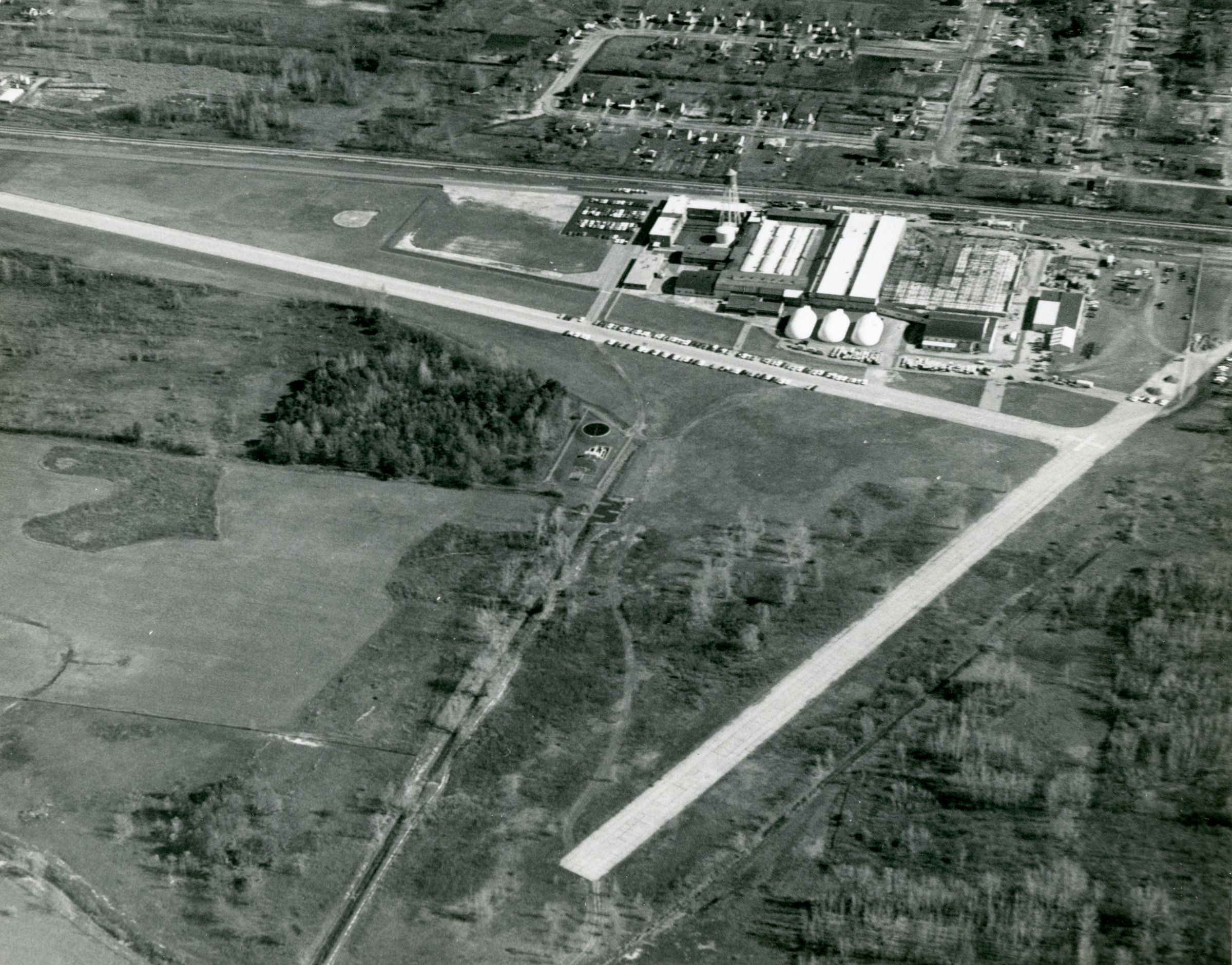 A photo of the Stinson Aircraft Factory taken from a Stinson single engine plane. The photo was taken in October of 1965 when it was the Detroit Diesel plantCataloged By