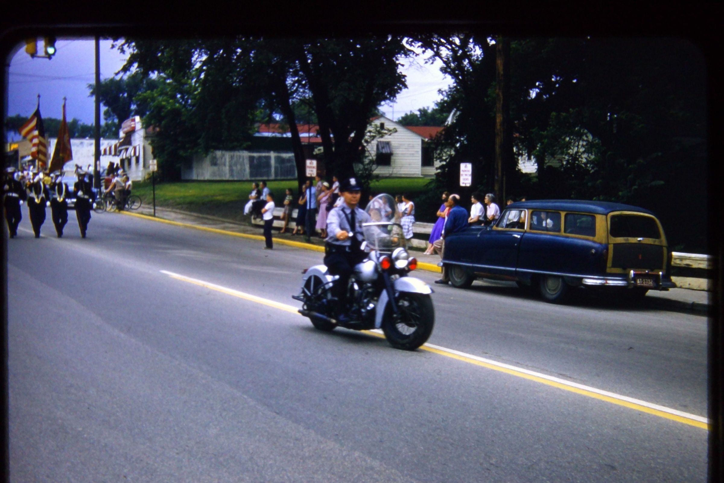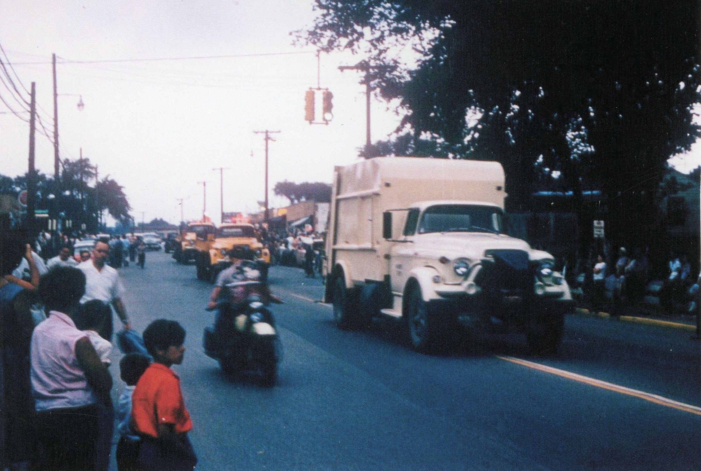 Parade, in front of fire station looking NE. Possibly Meldrum driving motorcycle. Willies ice cream, soda, candy, hobby shop in background at SE corner Wayne and Ash. 'Willies on the hill" 3201 S. Wayne Road.Cataloged By