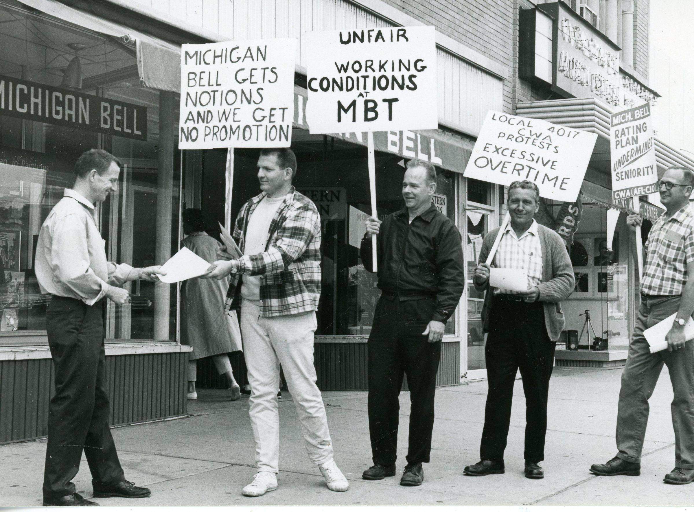 Michigan Bell Telephone Strikers in front of office on North side Michigan Ave on May 16, 1965. Photo taken by Nankin Eagle.