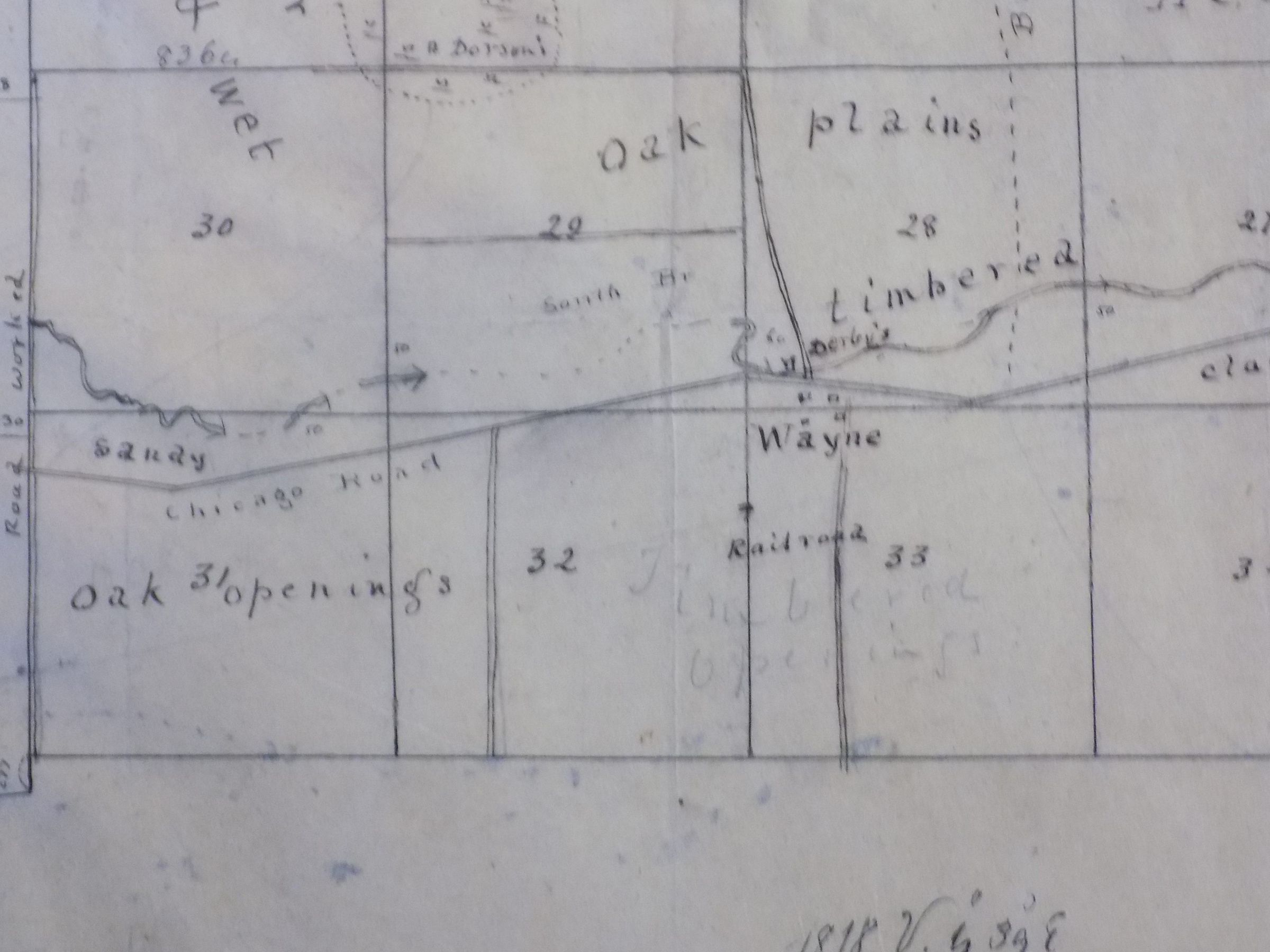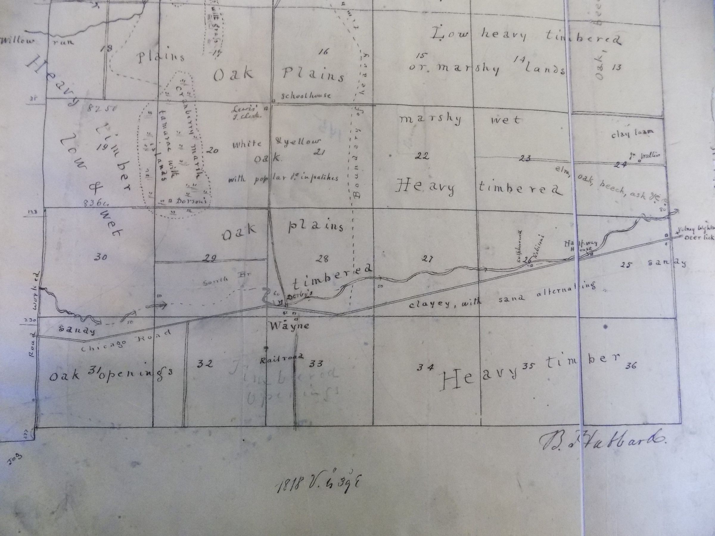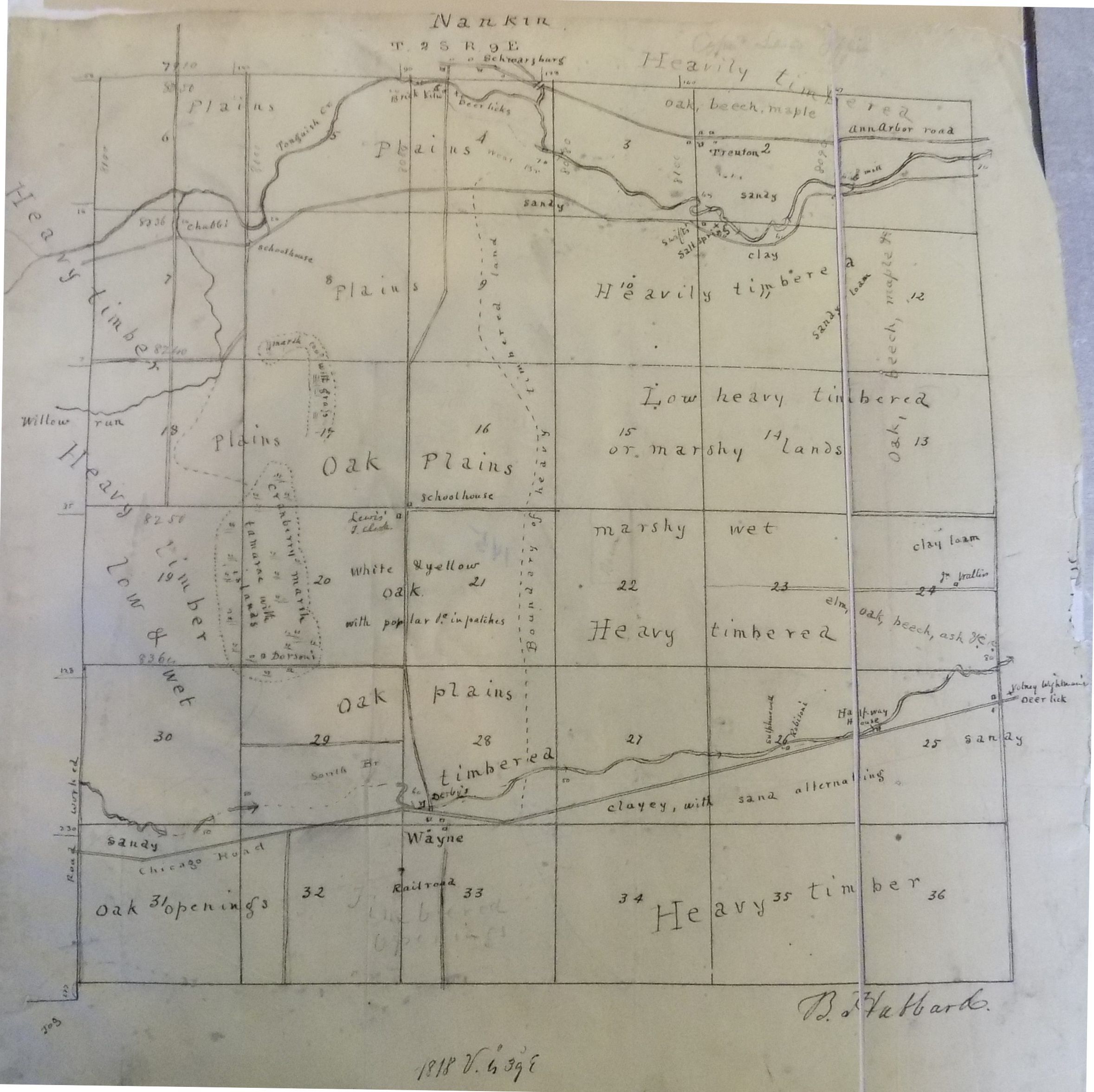 1832 Bella Hubbard Map of Nankin, on an 1818 map. Shows what the physical areas looked like, types of trees and soil, the Rouge River, Chicago Road and Derbys (Wayne)Cataloged By