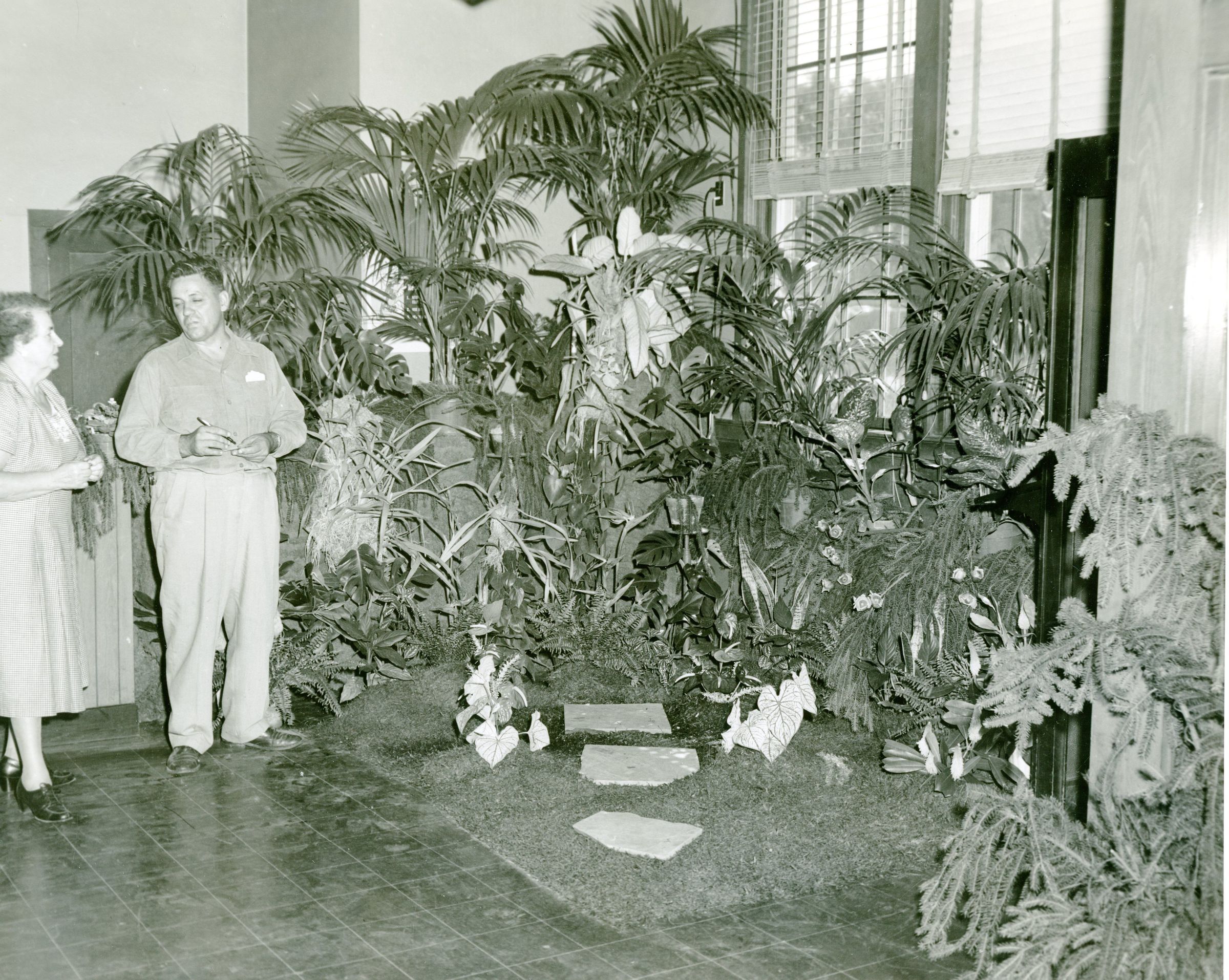 Estelle Jamieson and Virgil Krueger of the Garden Club preparing for the Flower Show at the old Rec Building that was built in 1942.