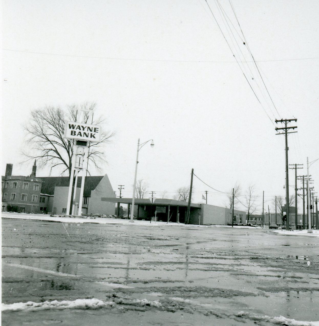 Biddle at Main, NW corner. Wayne Bank, Methodist Church. Feb. 1972, just after Urban Renewal.