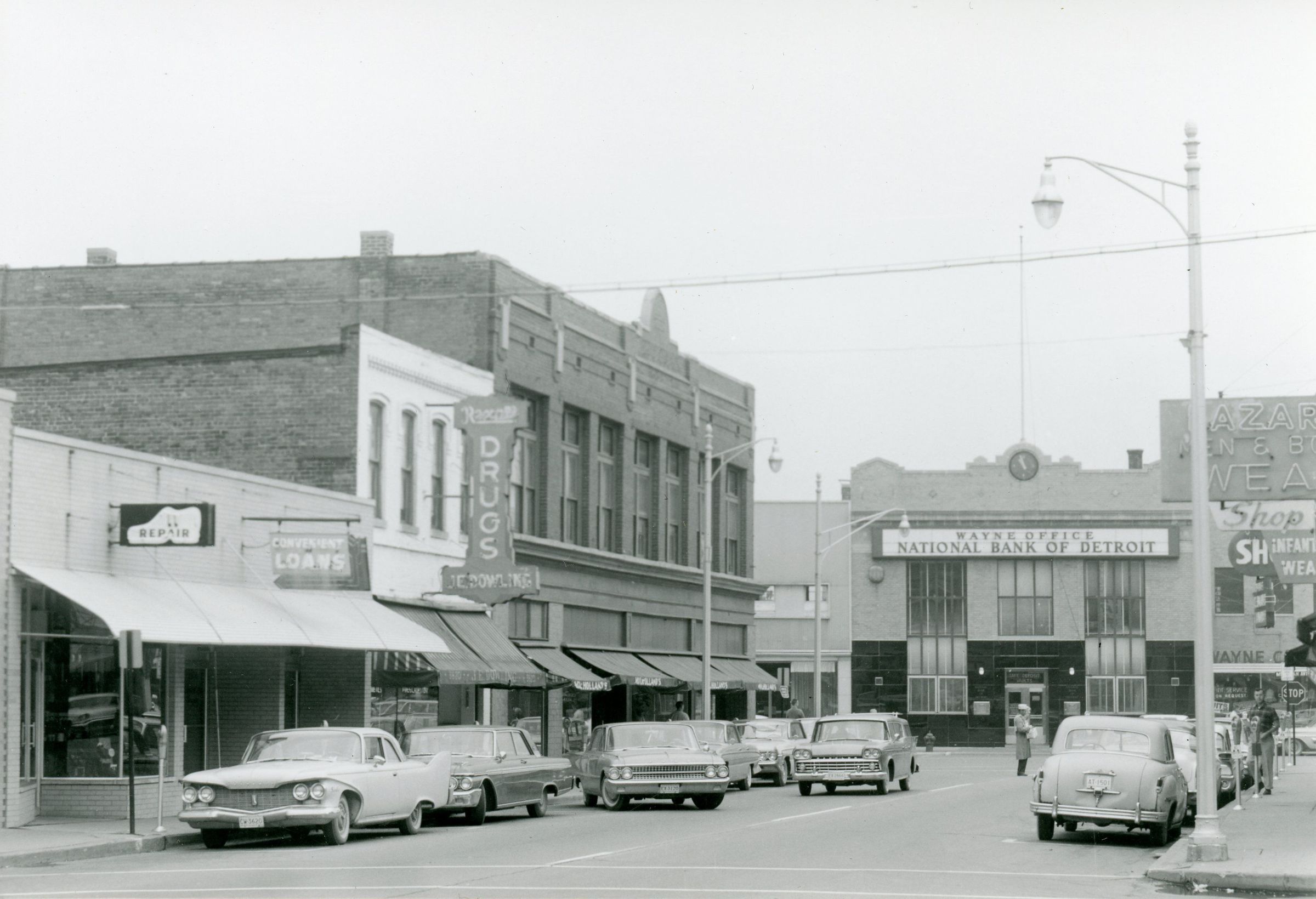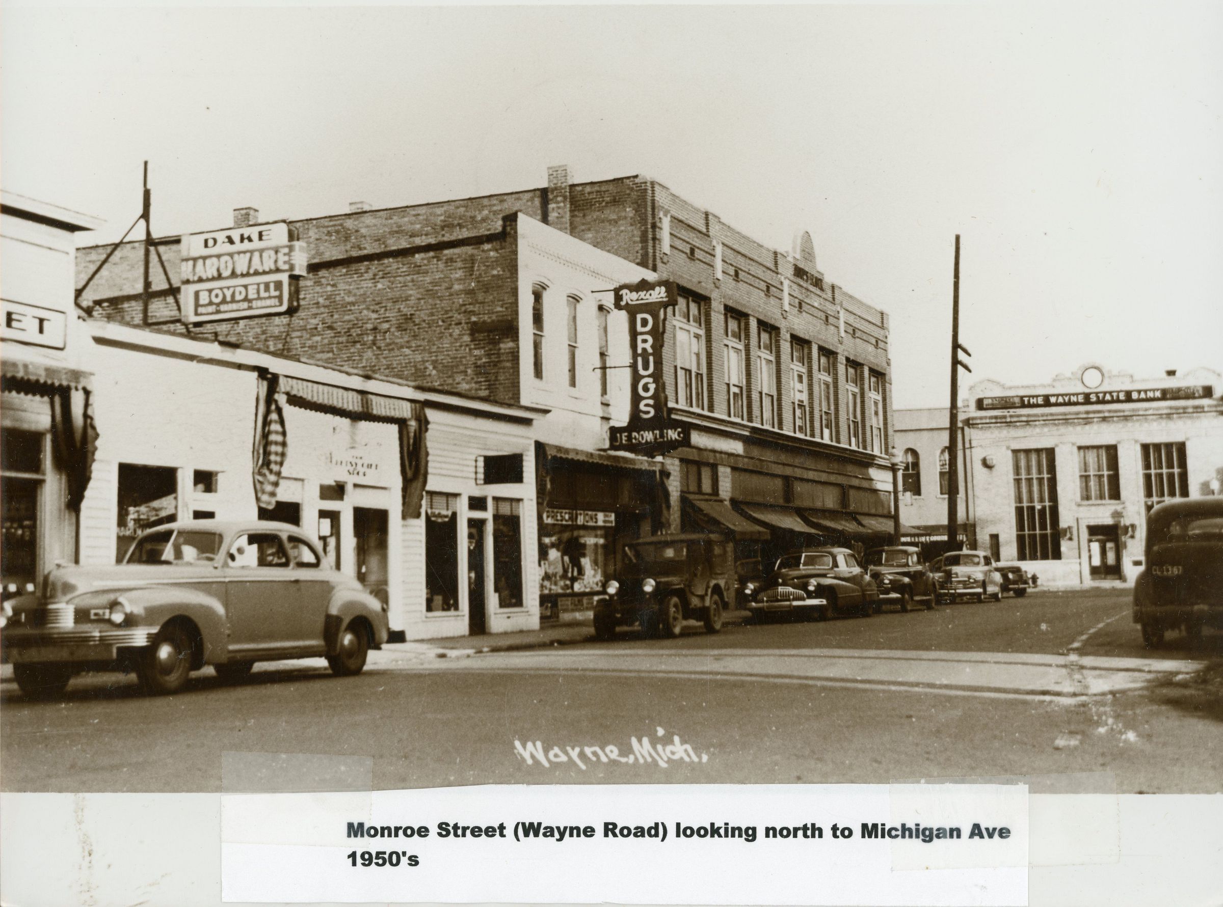 Looking north up Monroe towards Michigan. Dowling Drug store, Hoops Block at center. National Bank of Detroit, Lazars at right.Cataloged By