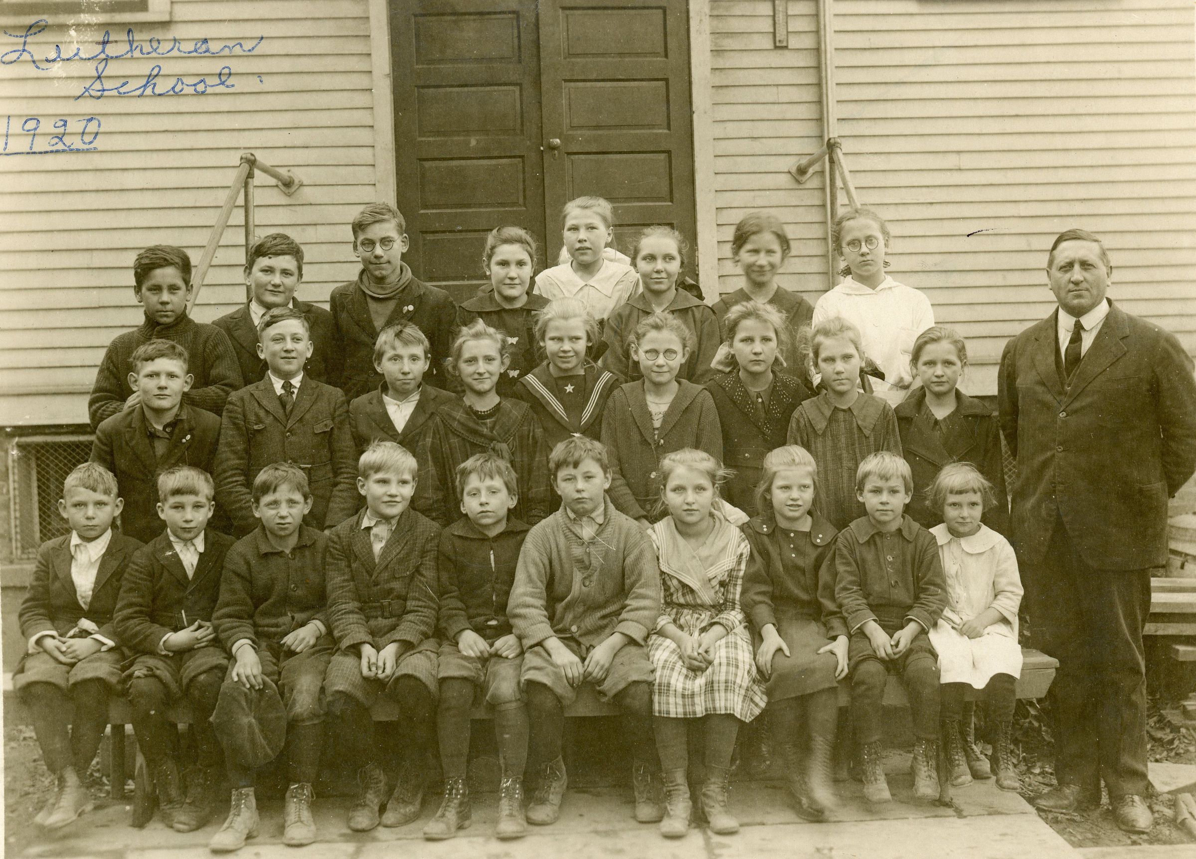 St. Johns Lutheran School 1920. Back Row: T. Tapke, Knopp, G. Dorrow, H. Prieskorn, M. Goudy, UK, UK, UK, Rev. Peters. Middle Row: H. Prieskorn, B. Hall, G. Peters, G. Moore, A. Prieskorn, Kessler, UK, UK, UK. Front Row: E. Stobb, W. Dittmar, T. Peters, O. Prieskorn, A. Peters, D. Knopp, B. Stobb, E. Prieskorn, R. Dittmar, E. Moore.Cataloged By