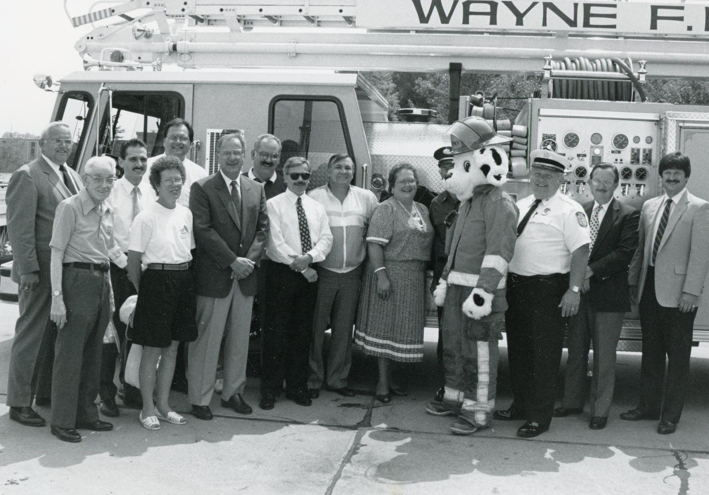 8-21-1991 Kiwanis President Marie Pluess & Members, Sparky, Public safety director Bennett, Art Morton, John Zech