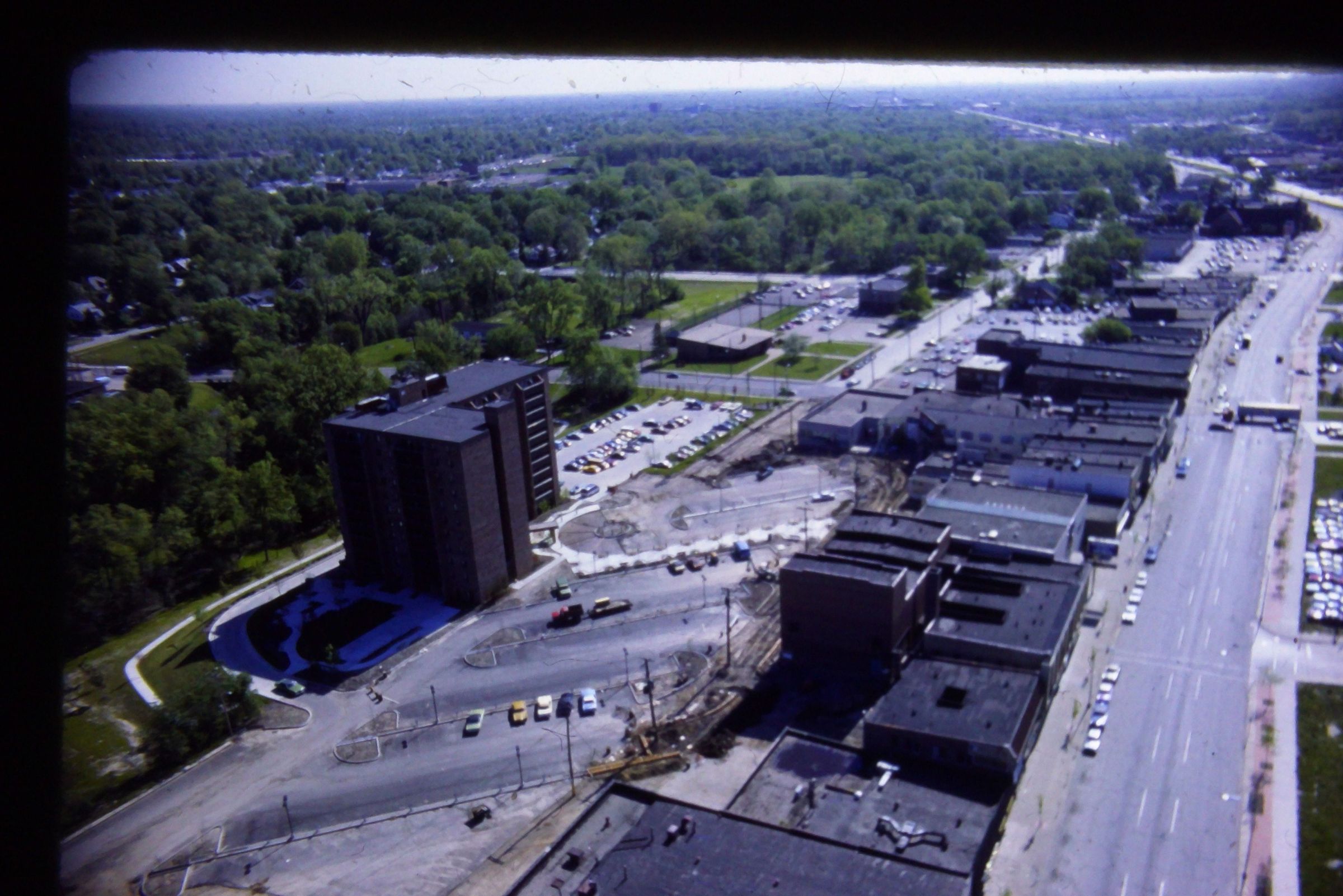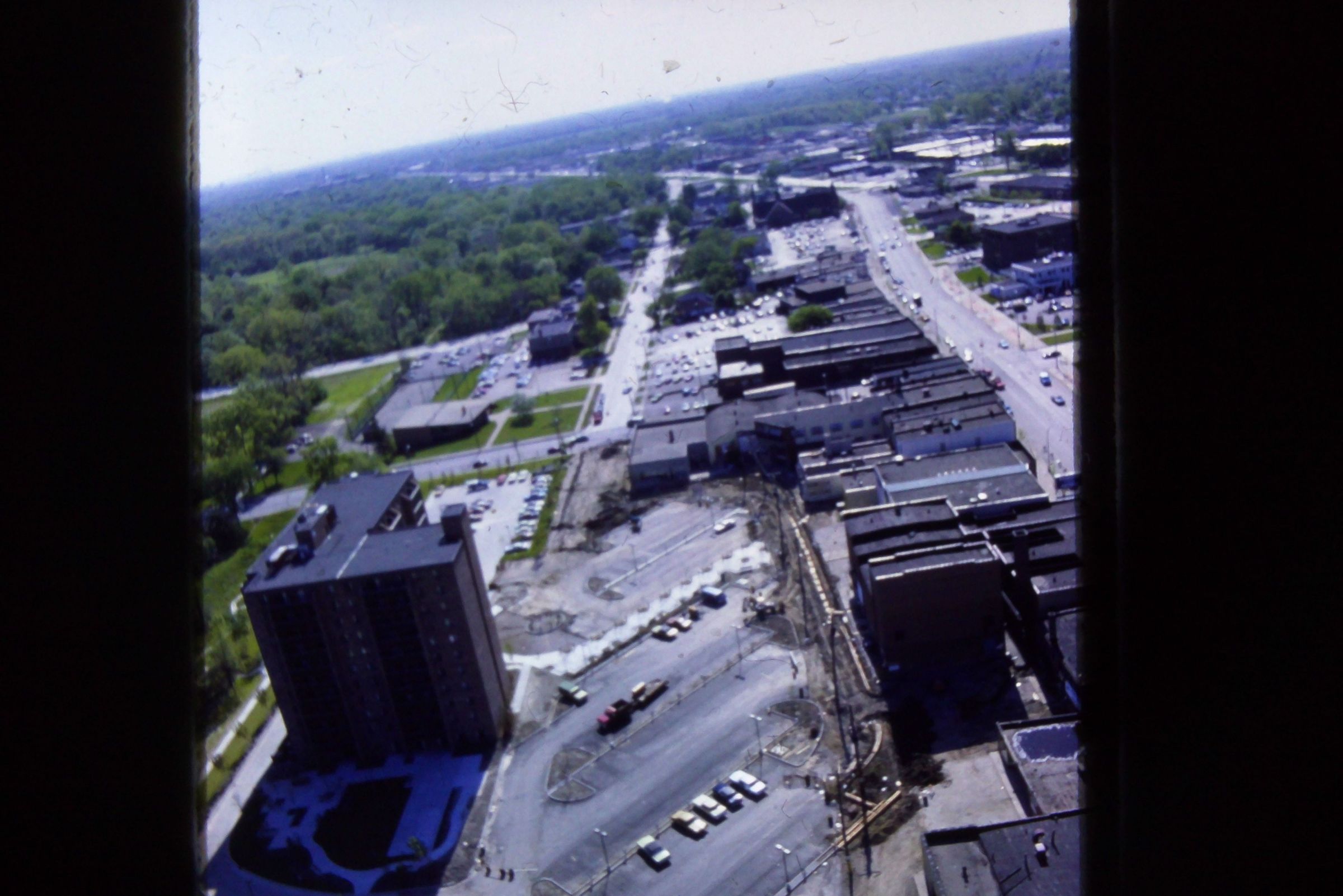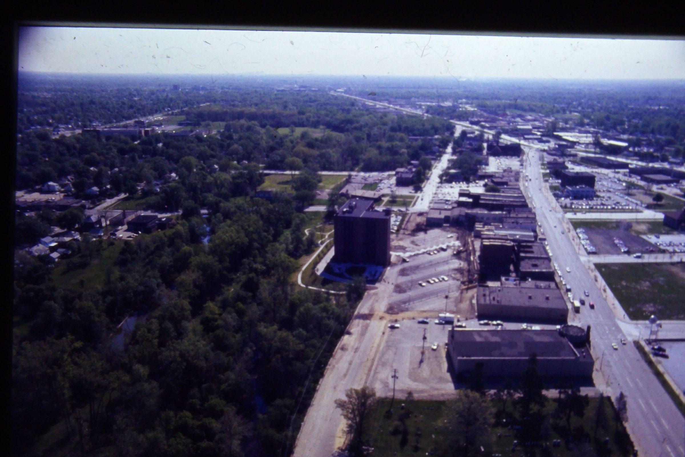 Aerial over Sims and Michigan Ave. WB, looking East. 1970s