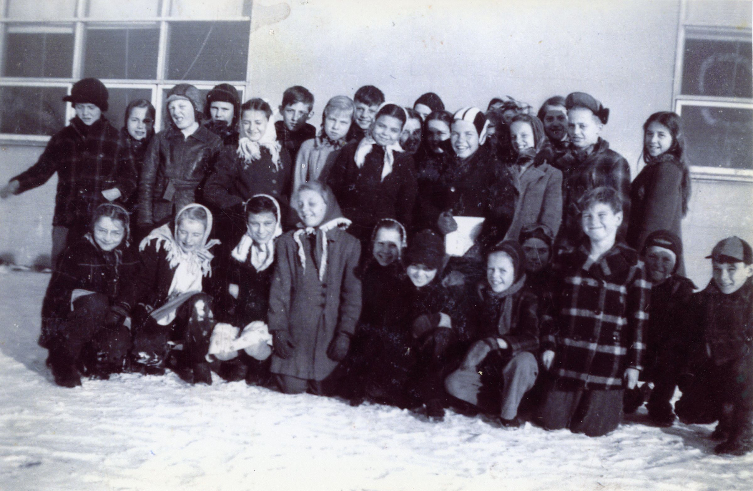 Jefferson School, later Jefferson Barnes Community Center. 32150 Dorsey Street, Westland. Norwayne in background. Children c. 1947. winter sceneCataloged By