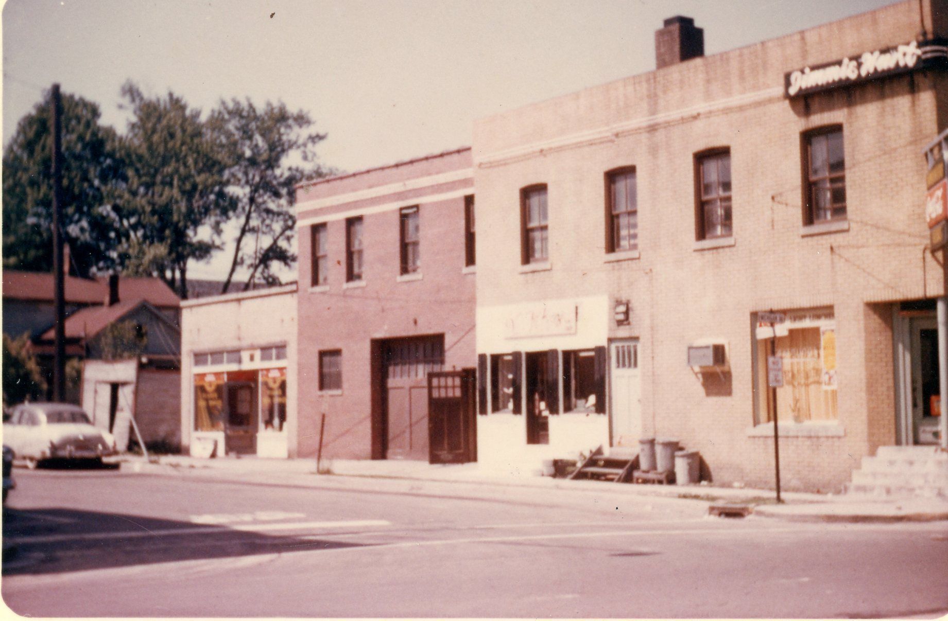 West side of Biddle at Michigan Avenue. 1957. 3600, 3610 and 3616 Biddle visible. Back of house at 35206 park visible at left. Sheilas restaurant, Jimmie Hunt dance studio.Cataloged By