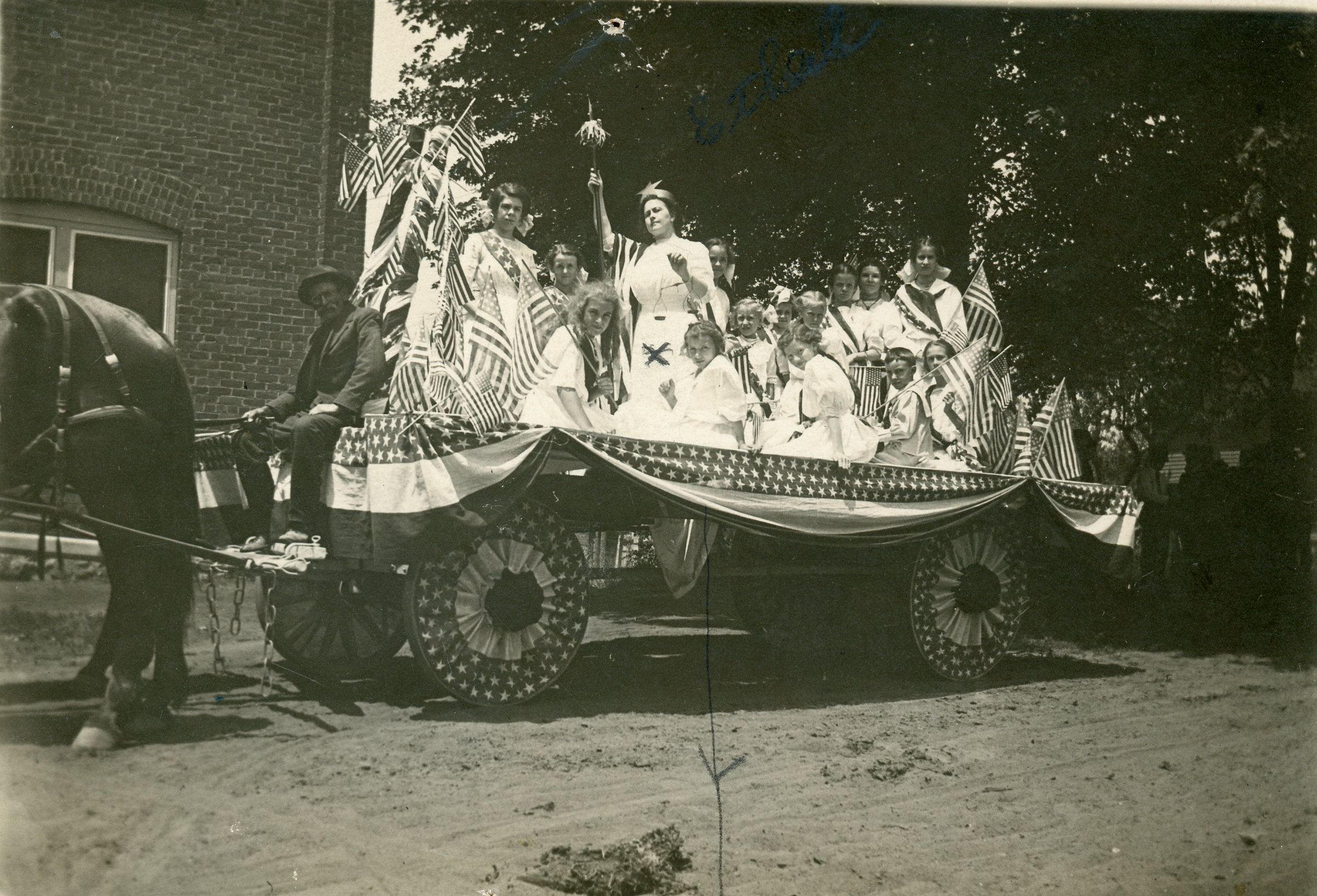 Patriotic Parade Float. Horse and Wagon. "Ethel" Standing. Unknown year or group