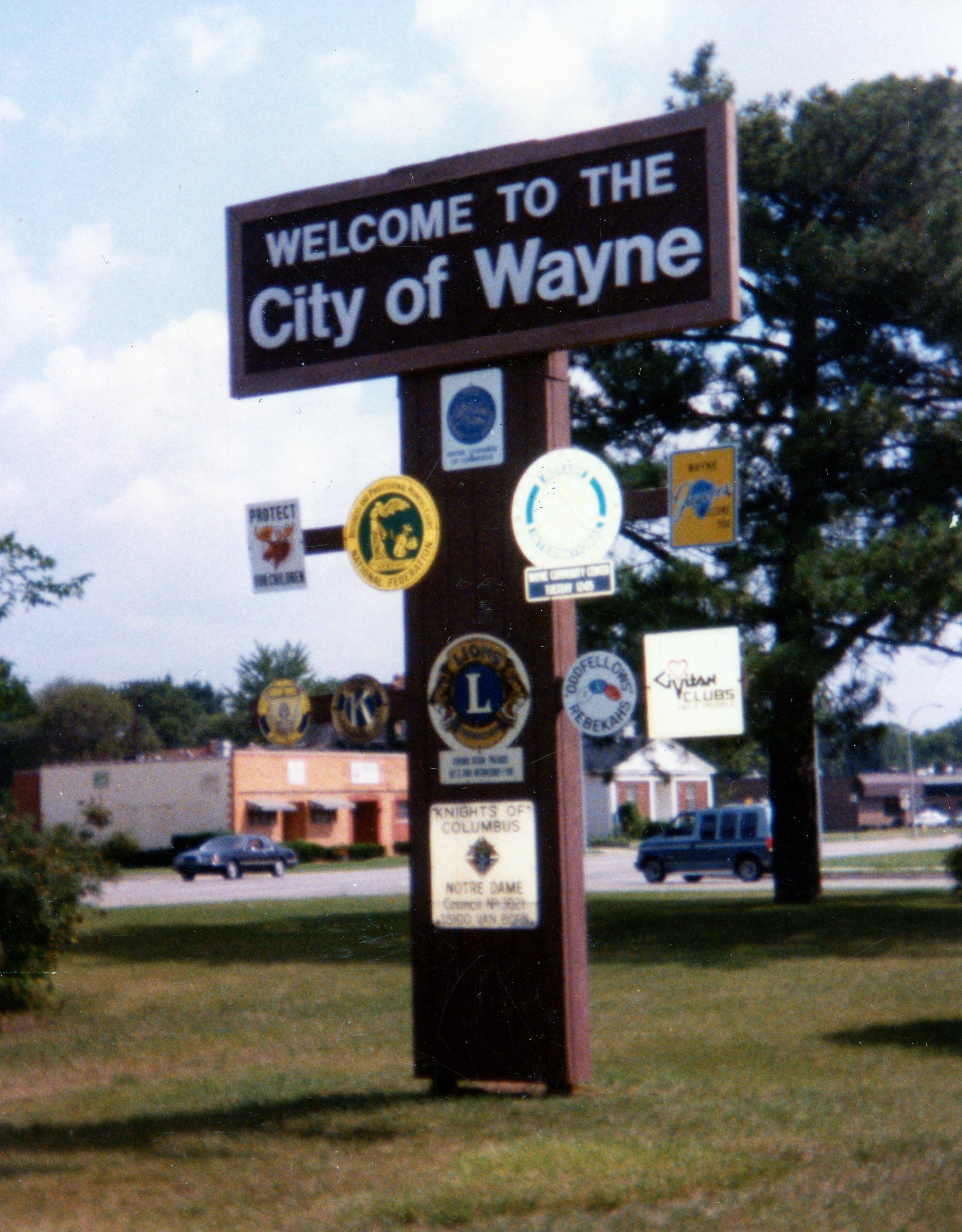 Welcome to Wayne sign, West Side at split. Late 1980s.