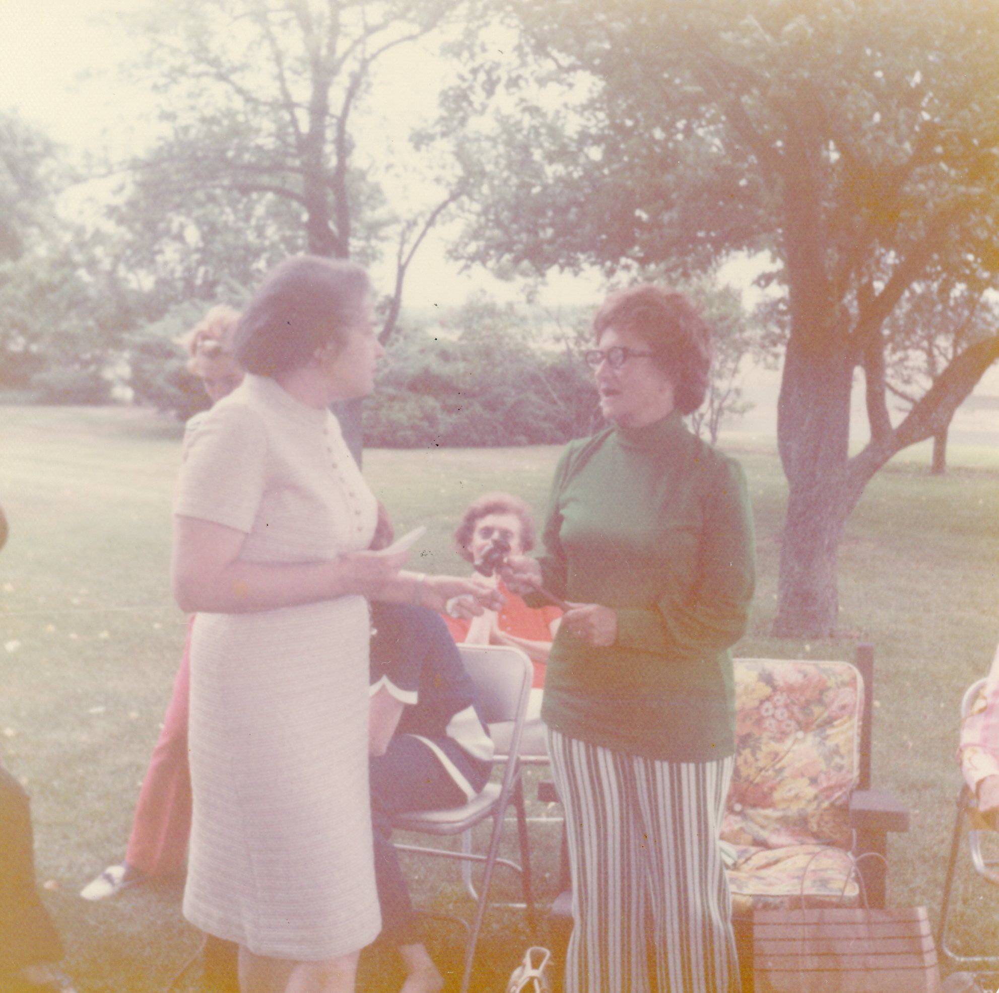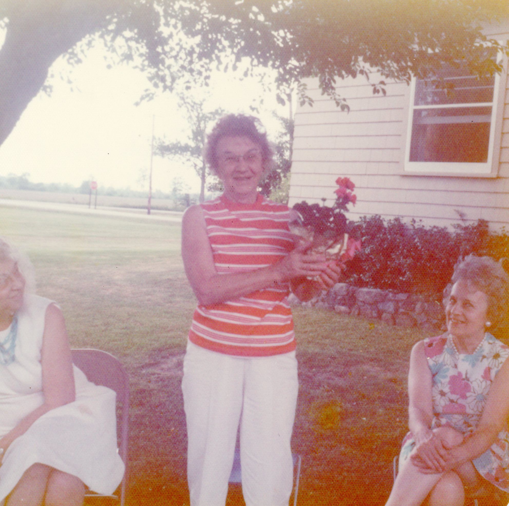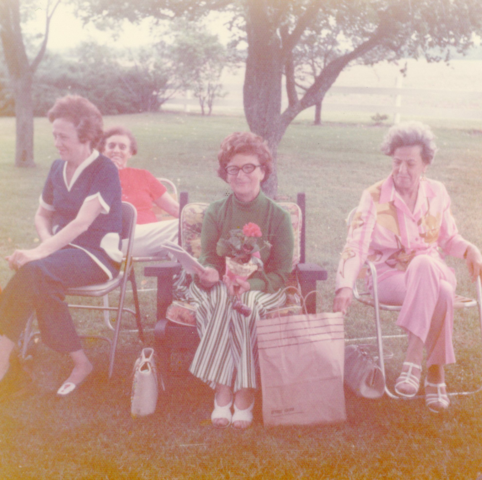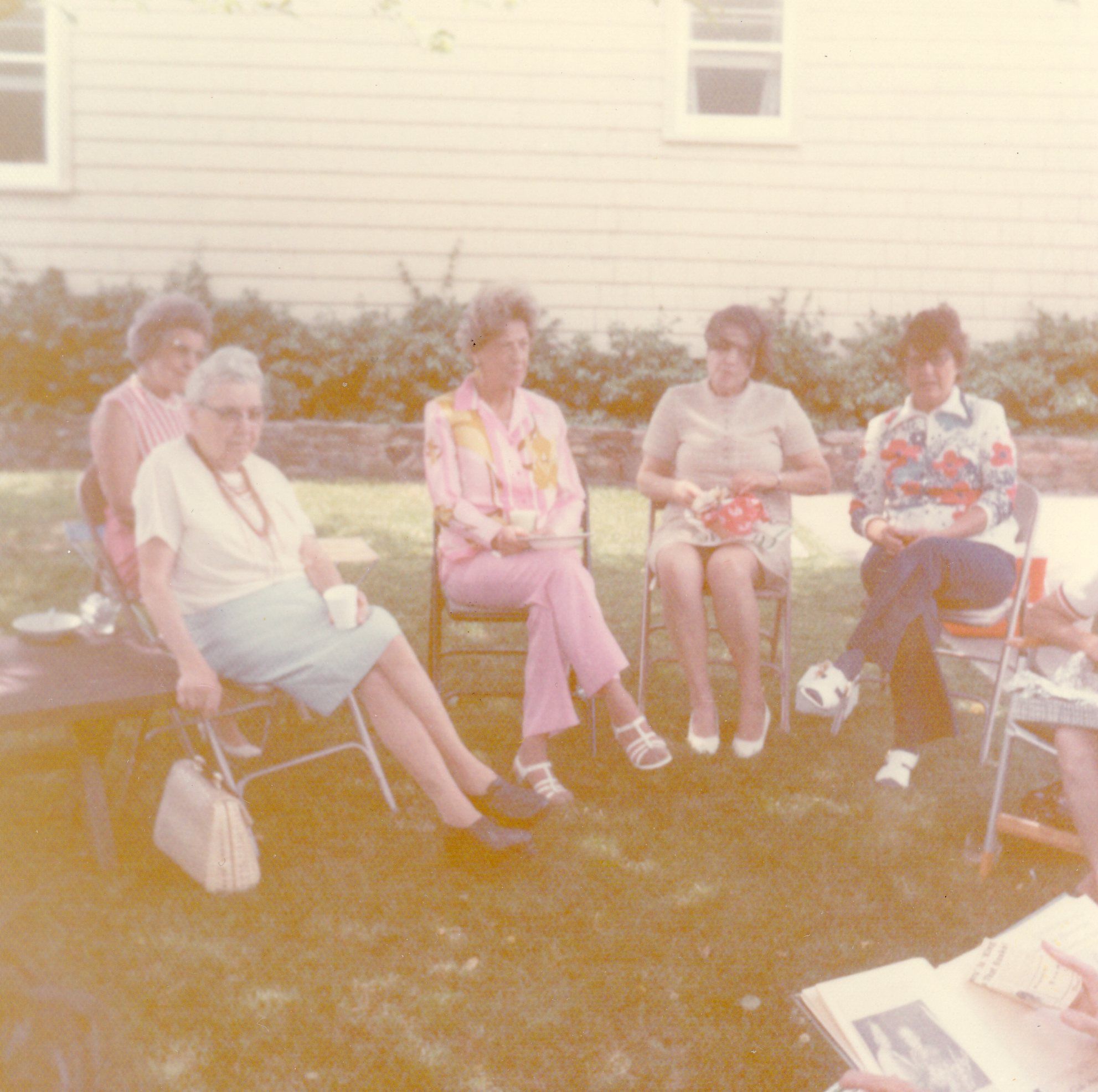In Back on Left is Nette Walker, In front from left is Lois Bateman, Marie Smith, Mildred Hanchett and Lourae Hillyard attending a Garden Club Meeting at Margaret Watrings House in June 13, 1973.Cataloged By
