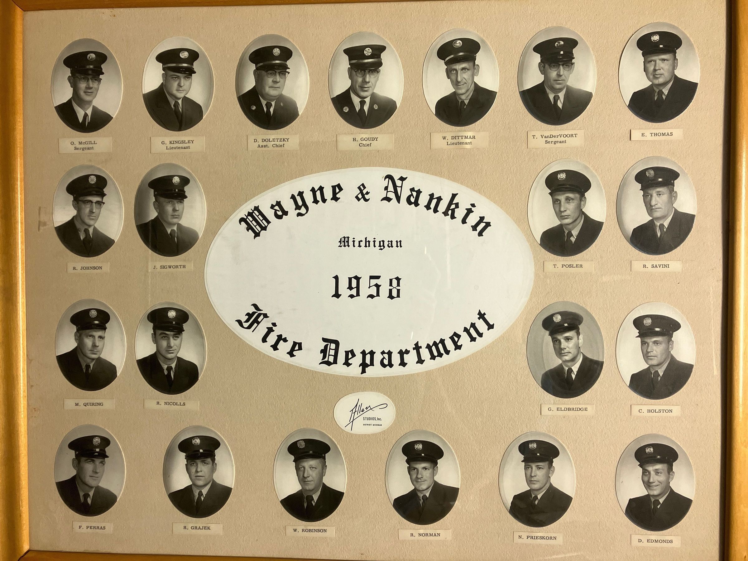 1958 Wayne and Nankin fire department. Owen McGill, Gerald Kingsley, D. Doletzky, Henry Goudy, William Dittmar, T. VanDerVoort, E. Thomas, Russell Johnson, J. Sigworth, T. Posler, R. Savini, M. Quiring, R. Nicolls, G. Eldbridge, C. Holston, F. Perras, R. Grajek, W. Robinson, R. Norman, Neil Prieskorn, D. Edmonds.Cataloged By