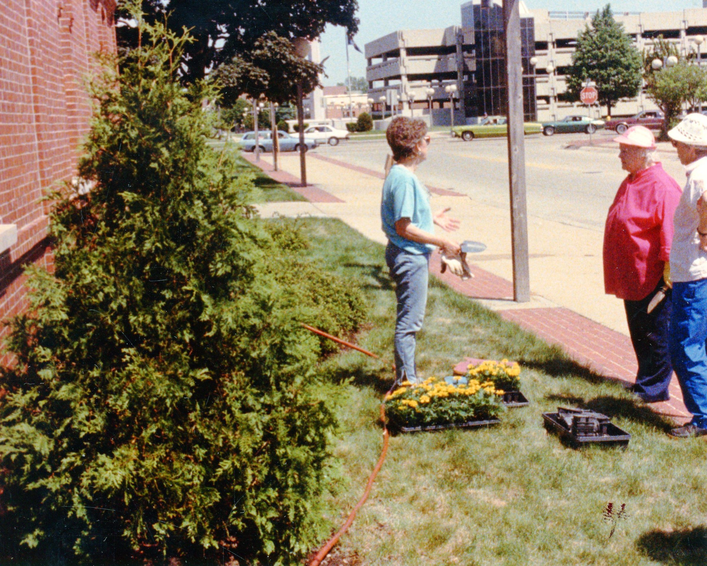 Garden Club Planting Flowers at the Wayne Historical Museum in spring of 1988. Sharon Author, Mrs Dickerson and Betty Young. This is the South side of the building. The address is 1 Towne Square St, Wayne 48184Cataloged By
