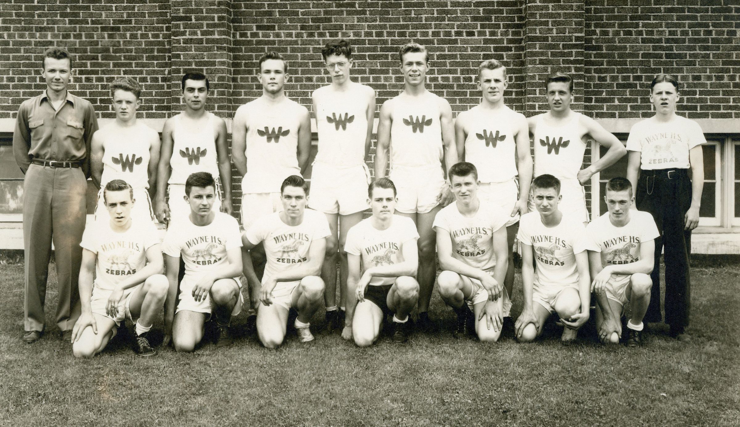 1943 WHS Track Team. Front Row L to R; Jim Noonan, Ray Long, Dwight Goodman, Chuck Proctor, Norm Gomolak, Lee Schmidt and Austin. Back Row L to R: Coach Dale Butler, Bill Kinncaid, Springer, Don Mason, Reid, Bill Terry, George Smith, Don Leppala and Mgr. Ron Cobb.Cataloged By