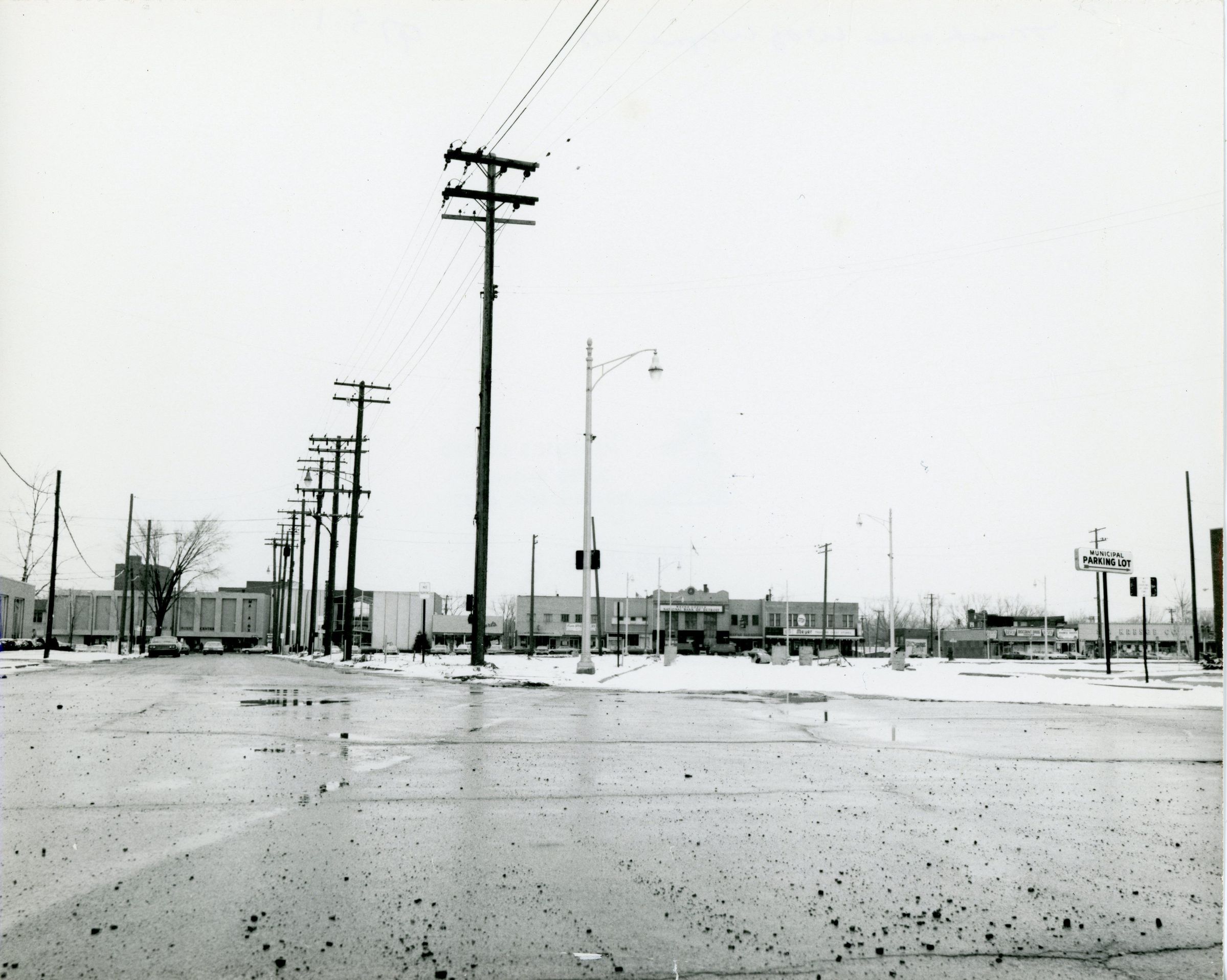 Biddle Street Near Park, looking North up Biddle towards Michigan Avenue. Camera angle roughly follows Old Monroe Street. February 1972, just after Urban Renewal.Cataloged By
