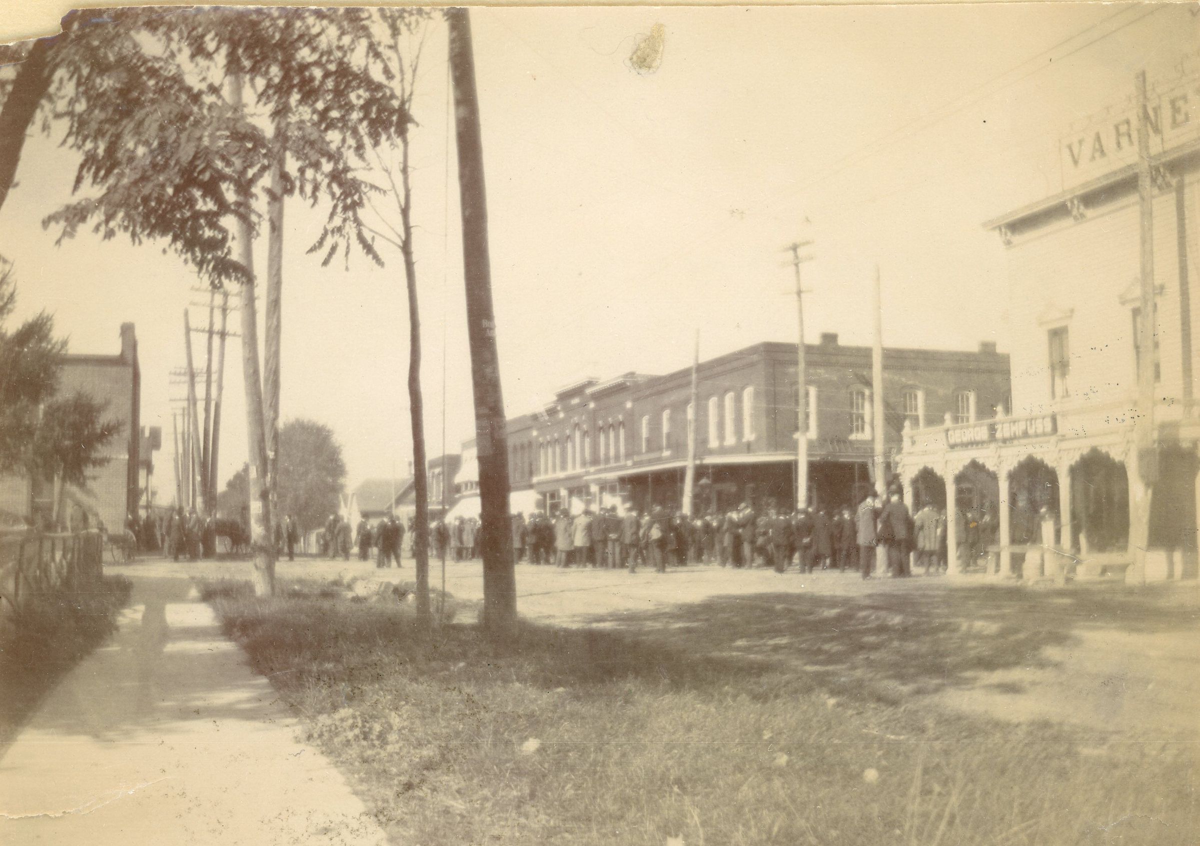 Michigan Avenue looking West towards Wayne road. Varney Zehpuss Hotel at right. Possibly County Democratic Convention Oct. 20, 1900. Bank Block visible.Cataloged By
