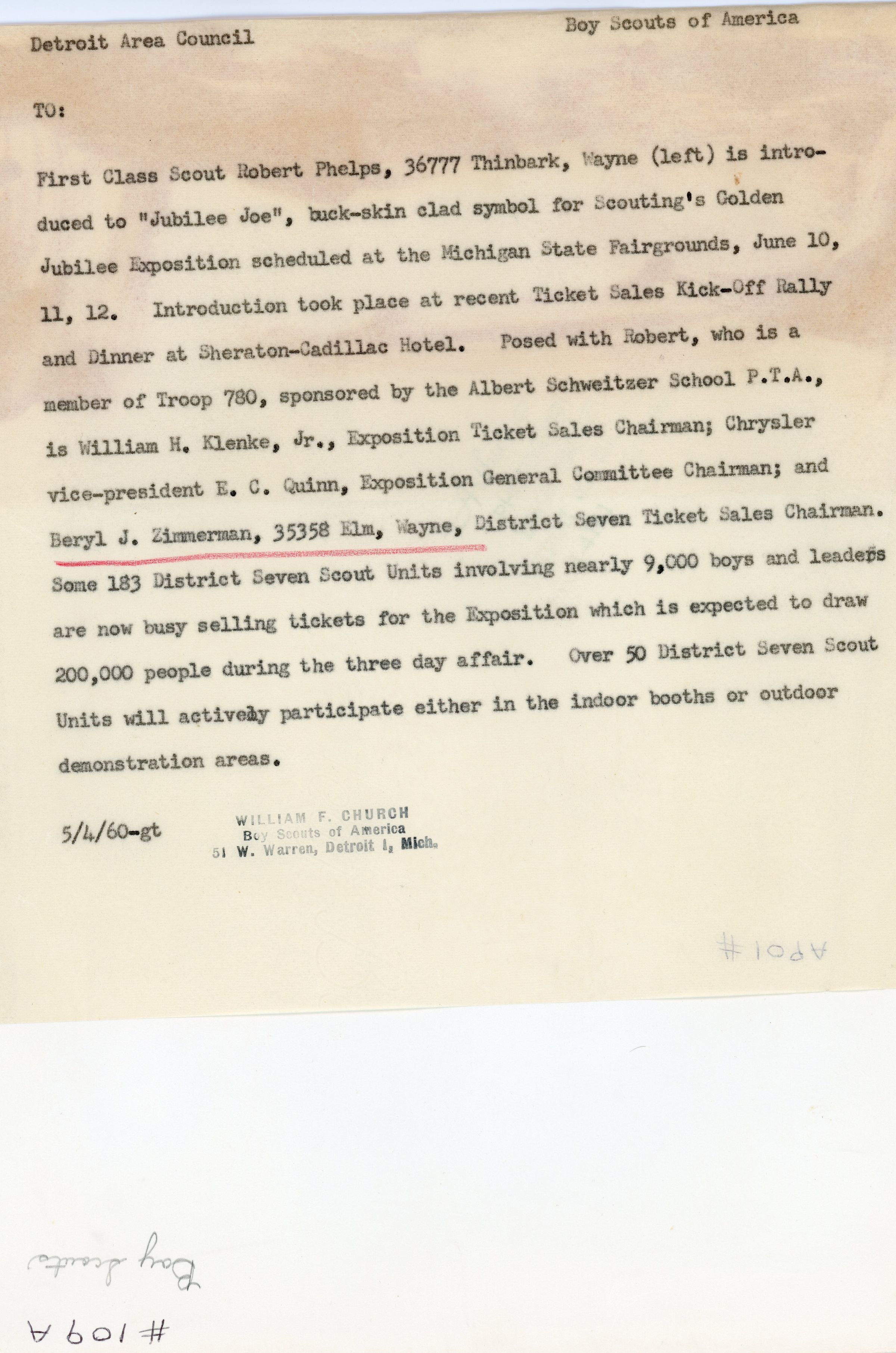 Boy Scouts "Jubilee Joe" Picture and Letter with First Class Scout Robert Phelps, William H. Klenke Jr., and Beryl Zimmerman.