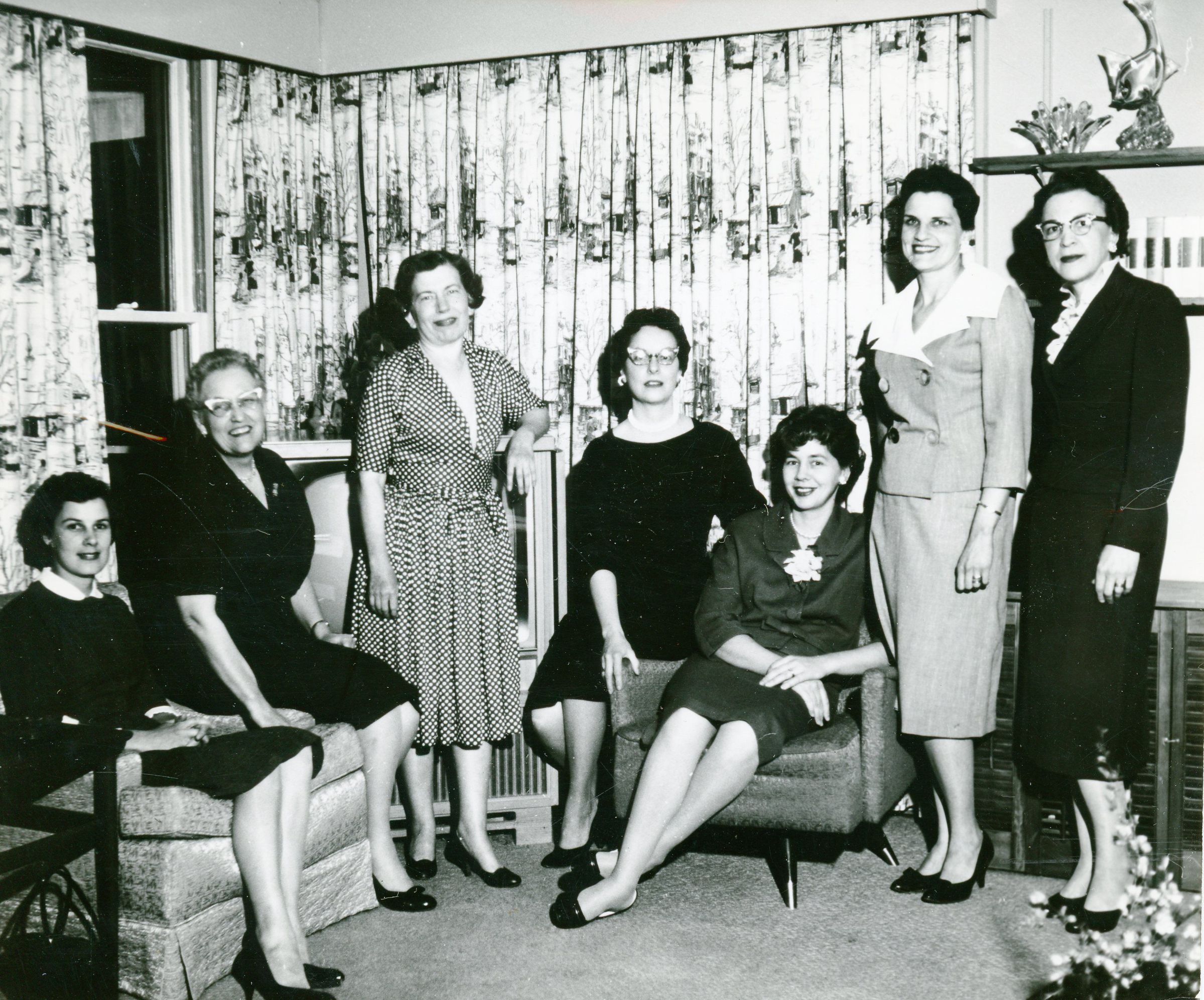 L-R: Bernice Becker, Mariam Morse, Helen Bird, Betty Rocabacker, unknown, Mariam Downes, Mrs. Charlie Curtis