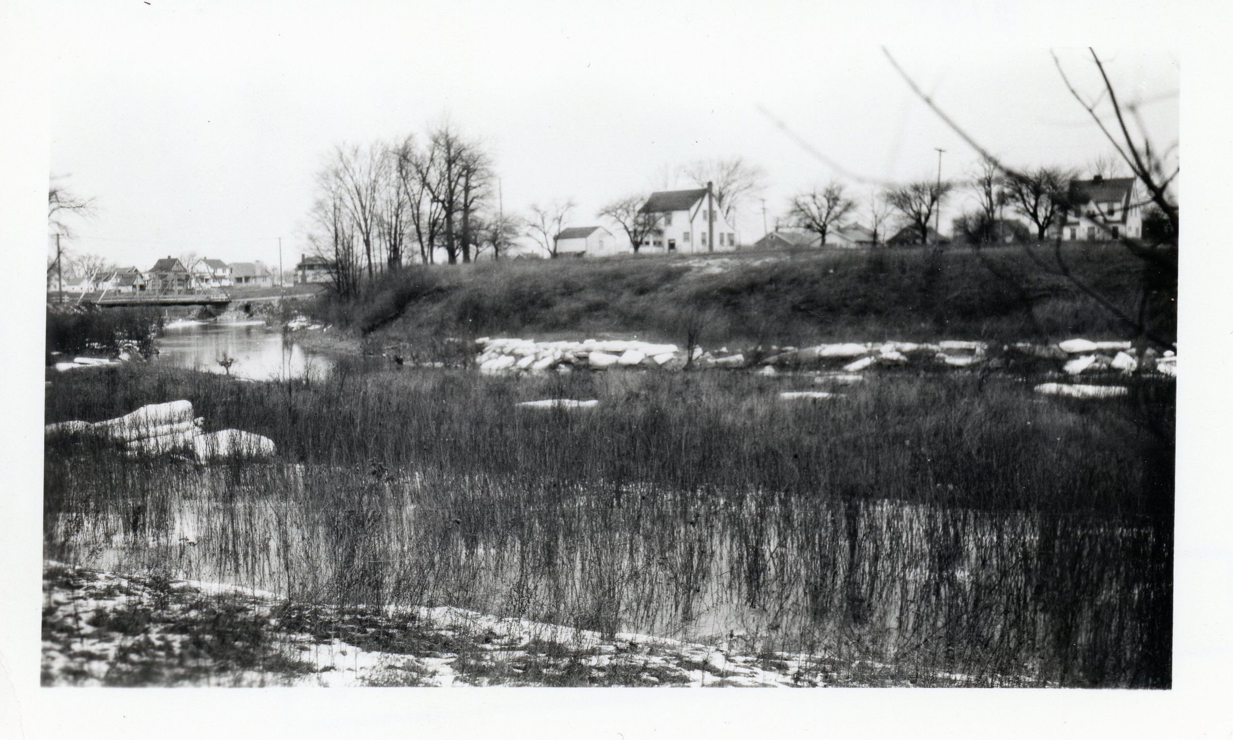 Rouge River and Elizabeth Street Bridge, 1929. looking NW. Houses along upper right are on Ash Street. 35318 Ash street far right.