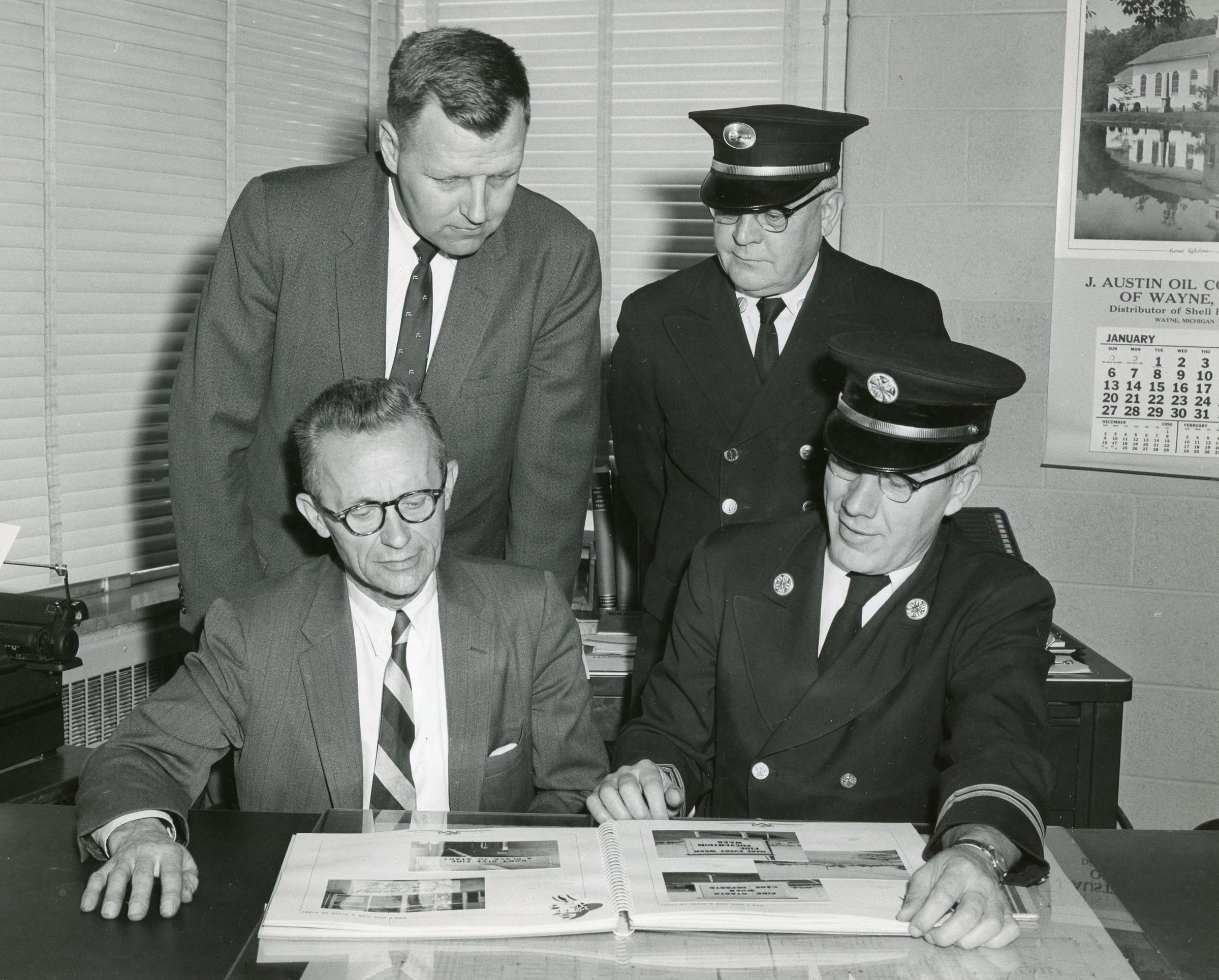 (Back Row) Joe Roberts (Ford Motor Co.), Fred Ashlock (Wayne Fire Marchal). (Sitting) Fire chief at Ford Plant, Fire Chief Henry Goudy,Cataloged By