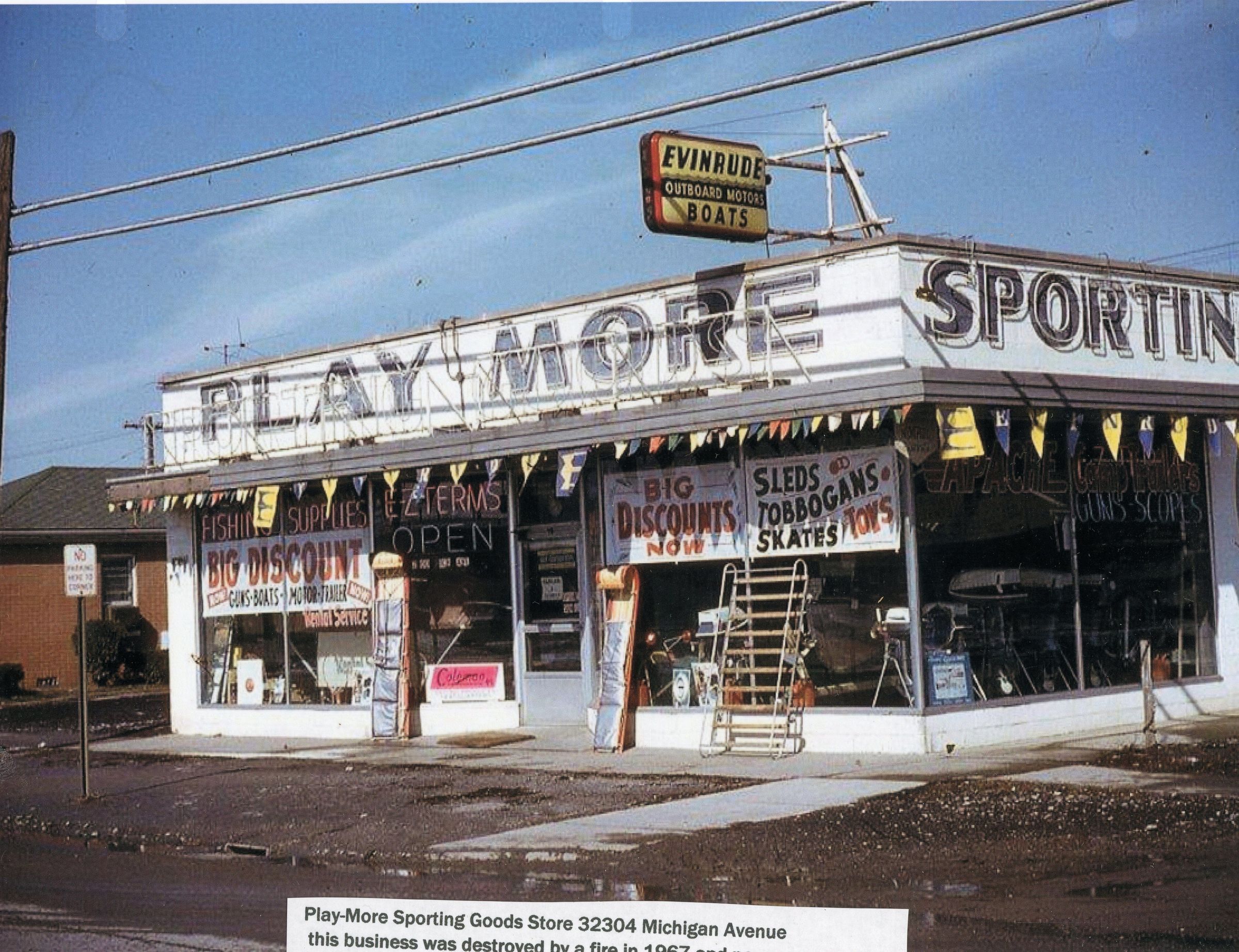 32304 Michigan - Play More Sporting Goods Store. Building burned down in 1967 and never rebuilt.