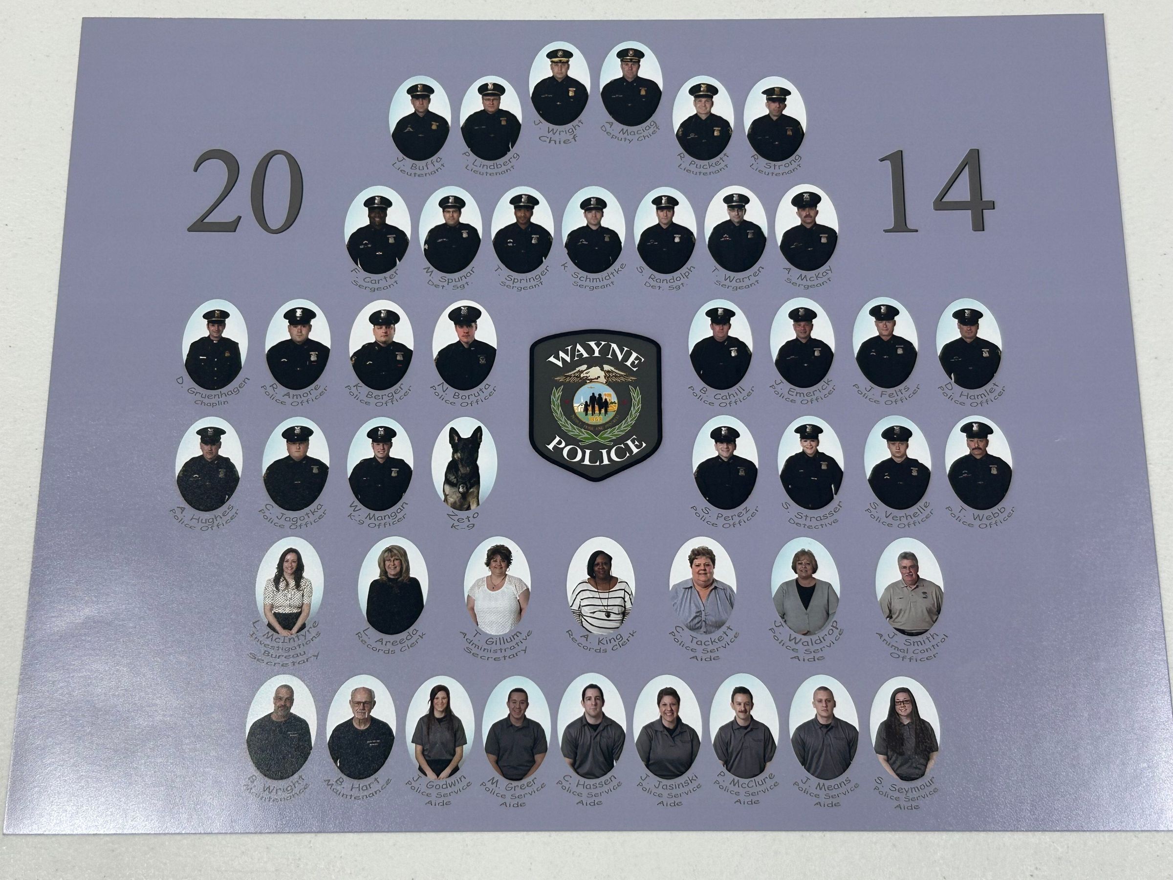 Top row: J. Buffa (Lieutenant), P. Linderberg (Lieutenant), J. Wright (Chief), A. Maciag (Deputy Chief), R. Puckett (Lieutenant), R. Strong (Lieutenant), F. Carter (Sergeant), M. Spunar (Det. sgt.), T. Springer (Sergeant), K. Schmidtke (Sergeant), S. Randoplh (Det. Sgt.), T. Warren (Sergeant), A. McKay (Sergeant). Middle row: D. Gruenhagen (Chapin), R. Amore (Police officer), K. Berger (Police officer), N. Boruta (Police Officer), B. Cahill (Police Officer), J. Emerick (Police Officer), J. Felts (Police Officer), D. Hamlet (Police Officer), A. Hughes (Police Officer), C. Jagotka (Police Officer), W. Wangan (K-9 Offcier), Zeto (K-9), S. Perez (Police Officer), S. Strasser (Detective), S. Verhelle (Police Offcier), T. Webb (Police Offcier). Bottom row: L. McIntyre (Investigation Bureau Secretary), L. Areeda (Records Clerk), T. Gillum (Adminstrative Secretary), A. King (Records Clerk), C. Tackett (Police Service Aide), J. Waldrop (Police Service Aide), J. Smith (Animal Control Officer), B. Wright (Maintenance), B. Hart (Maintenace), J. Godwin (Police Service Aide), M. Greer (Police Service Aide), C. Hassen (Police Service Aide), J. Jasinski (Police Service Aide), P. McClure (Police Serivce Aide), J. Means (Police Service Aide), S. Seymour (Police Service Aide)