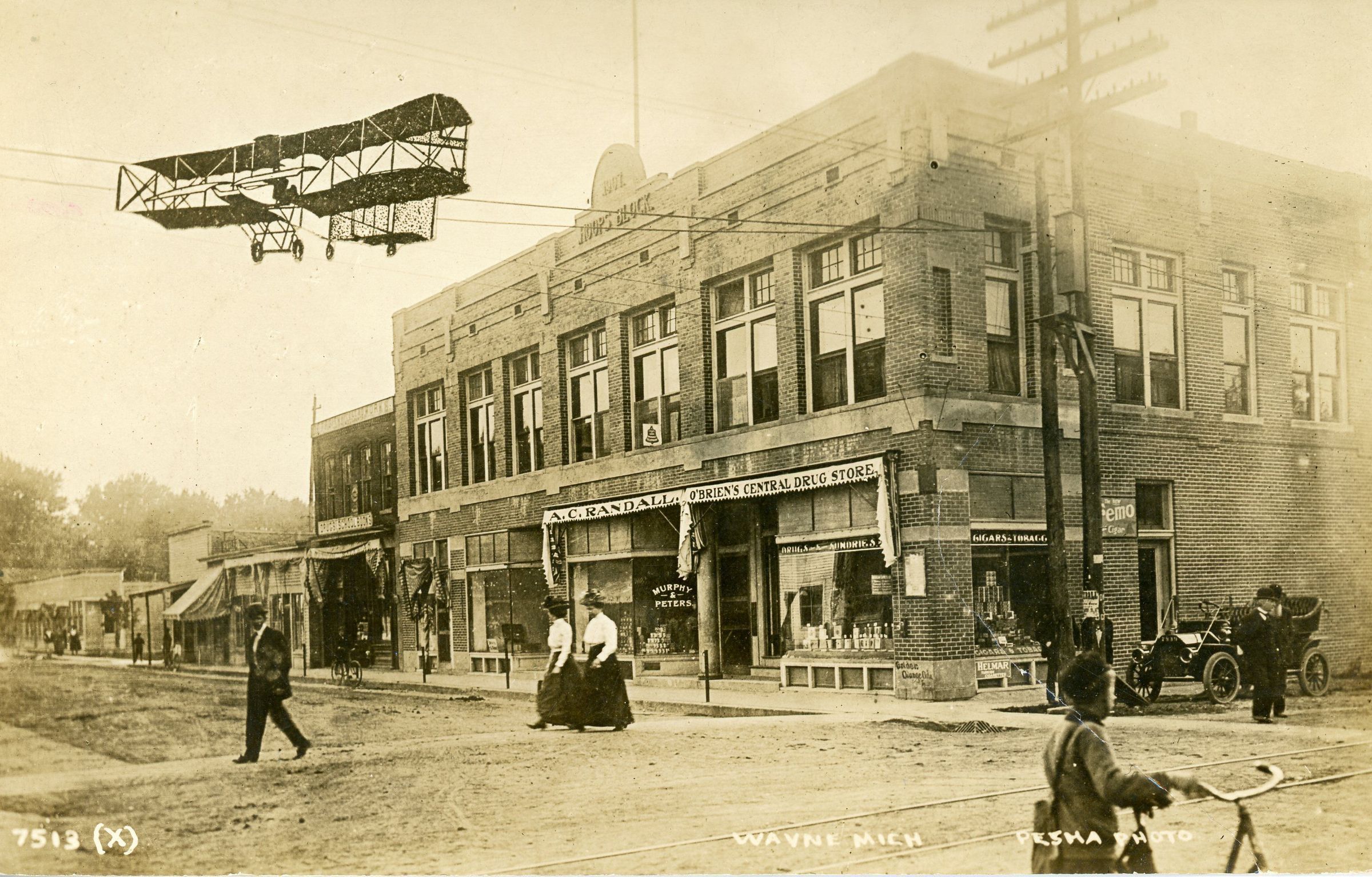 3602 Monroe - Hoops Block - Trick Photo showing plane flying over Monroe, SW corner Michigan and Monroe. Faced Monroe. Built 1909, Original home of Mulhollands and O'Briens Drug Store. Torn down for Urban Renewal 1972.Cataloged By