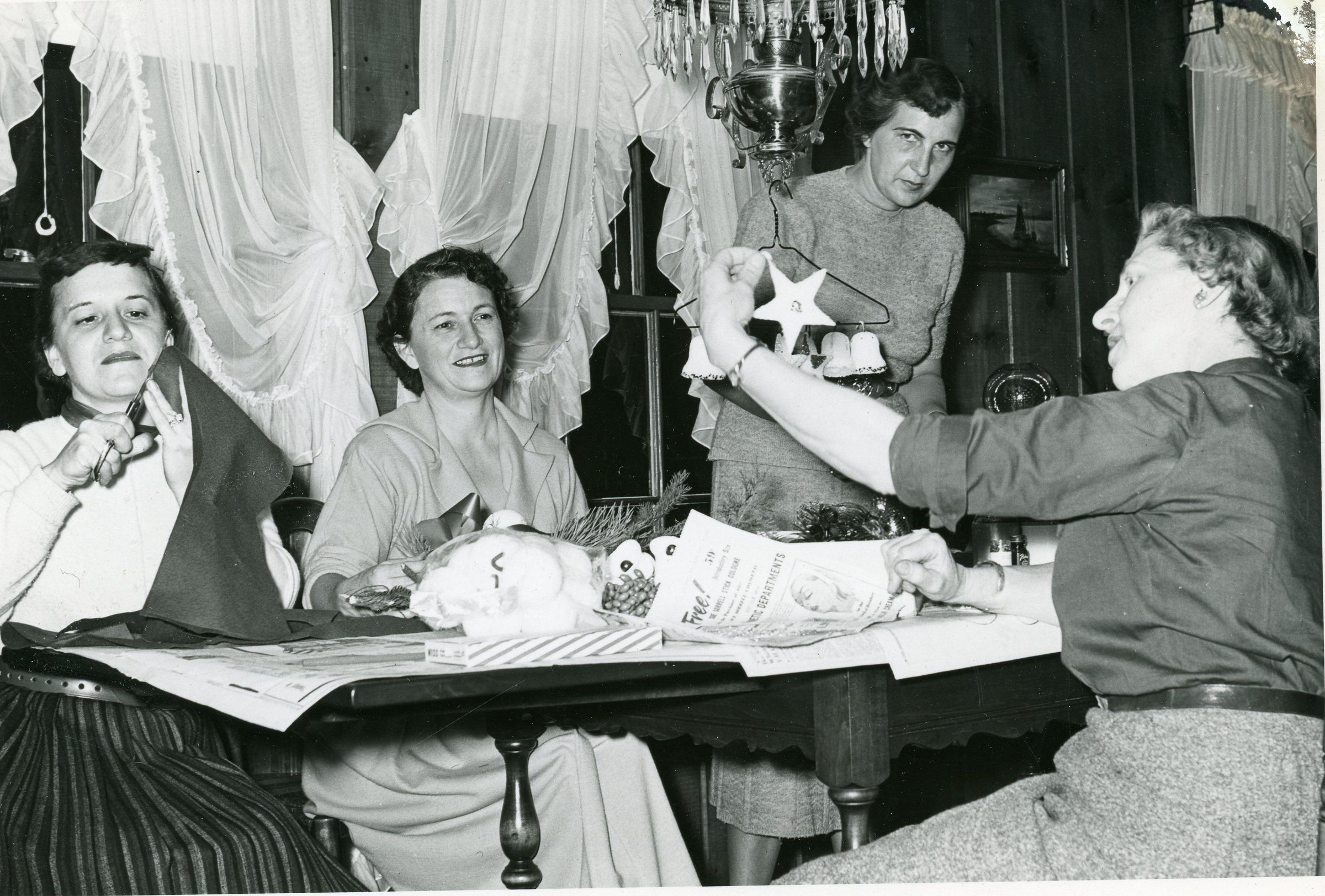 Margaret Wotring, Catherine Krueger, Ruth Hawley, Orpha Hutley. Making Holiday trims in the Krugers living room.