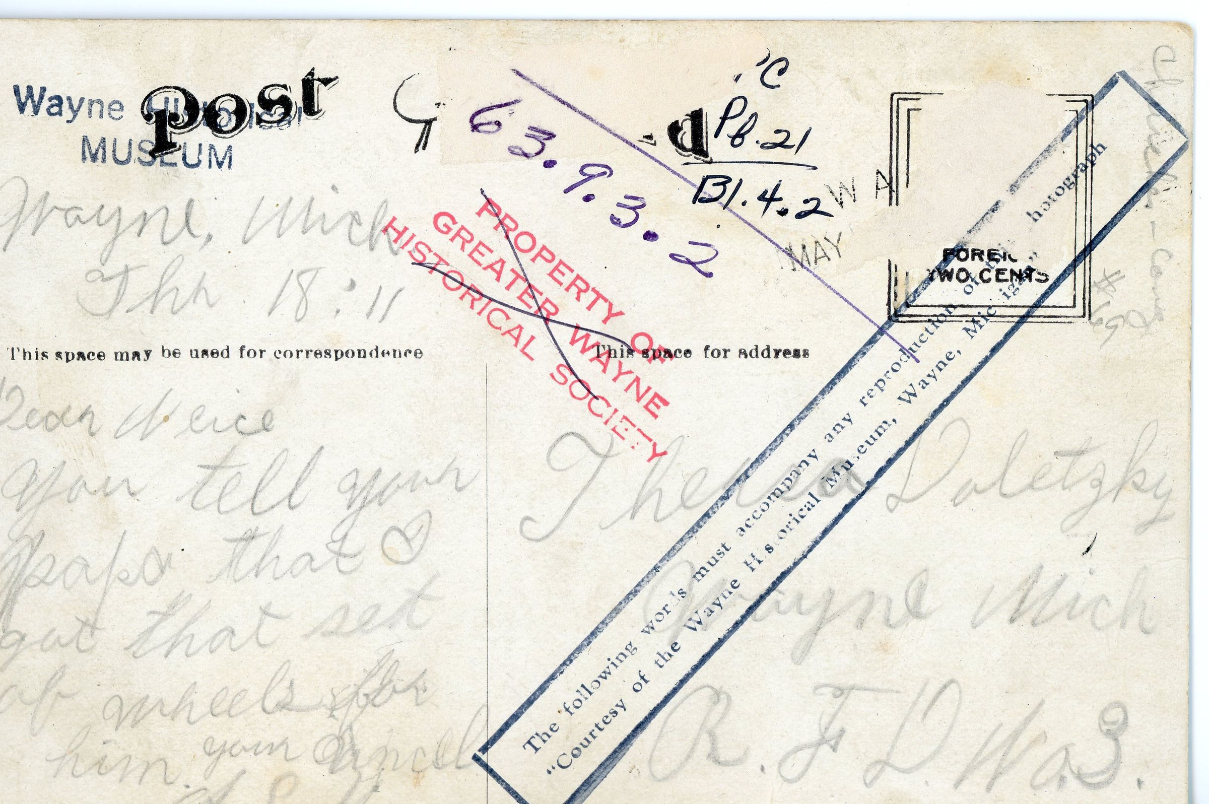 " Wayne, Mich John 18:11 Dear Niece, you tell your papa that I got that set of wheels for him. Your Uncle, A.S.H." sent to Theresa Daletzky.