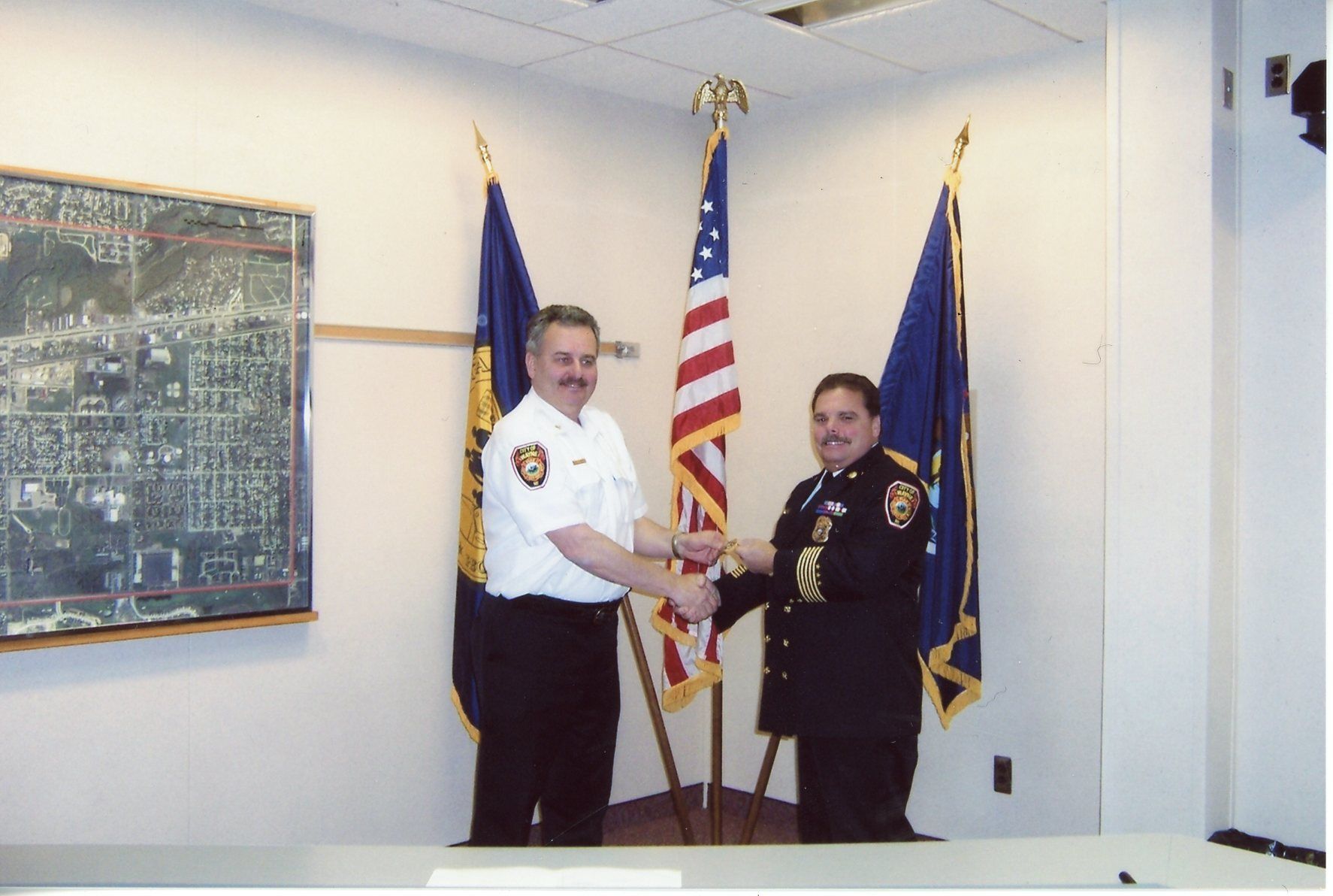 Fire Chief Tim Reylords shaking hands with Fire Chief Mel Moore in 2008.