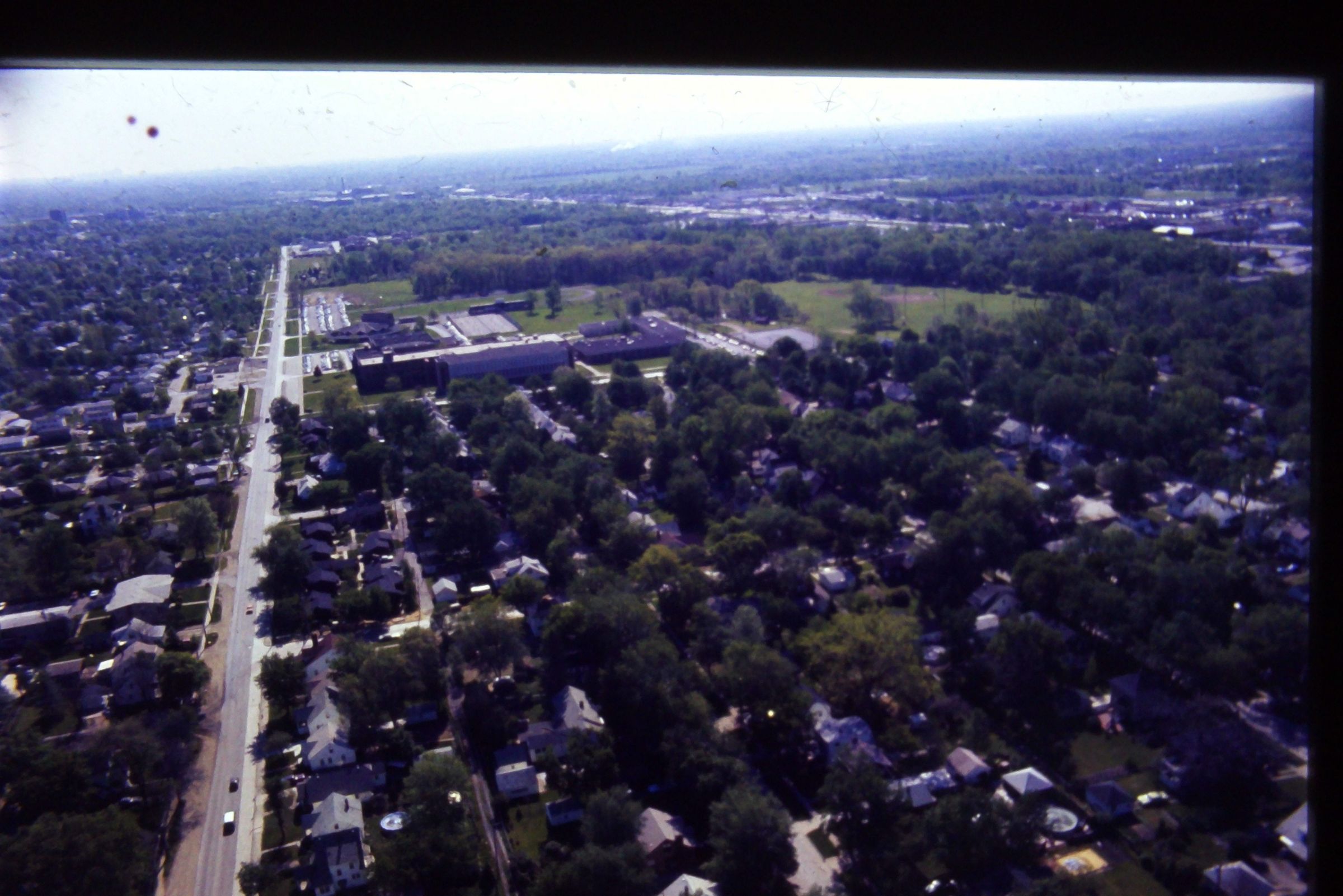 Aerial over Glenwood road, looking East. 1977. Wayne Memorial in Center