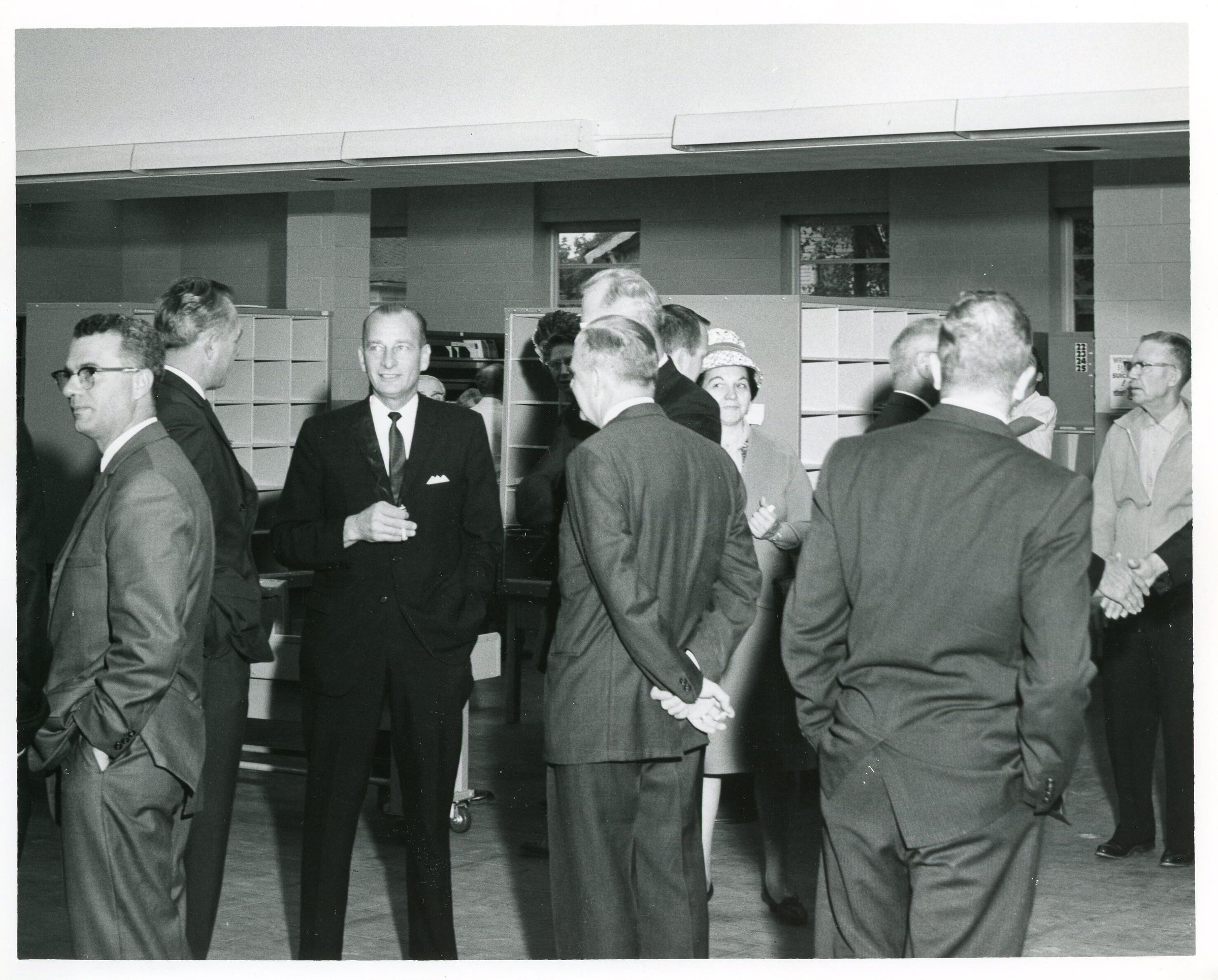 Post Office Dedication for 1964 remodeling. John Lesinski and Dan Howell talking to people.