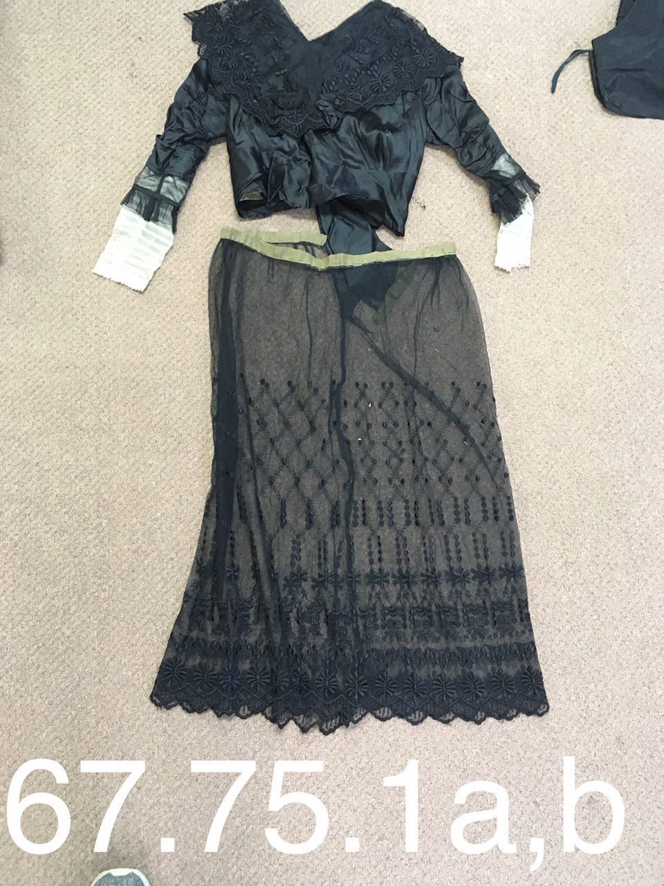 Black Silk dress with black net, originally had a black silk underskirt (Missing before donated).