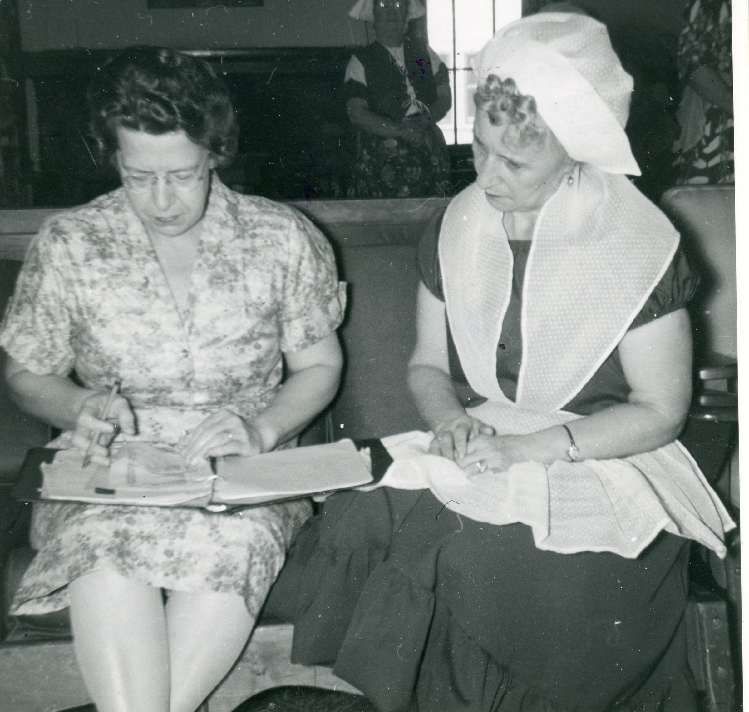 Mrs Herbert Kelly and Mrs Clyde Story working on plans for the Congregational Church Bazaar