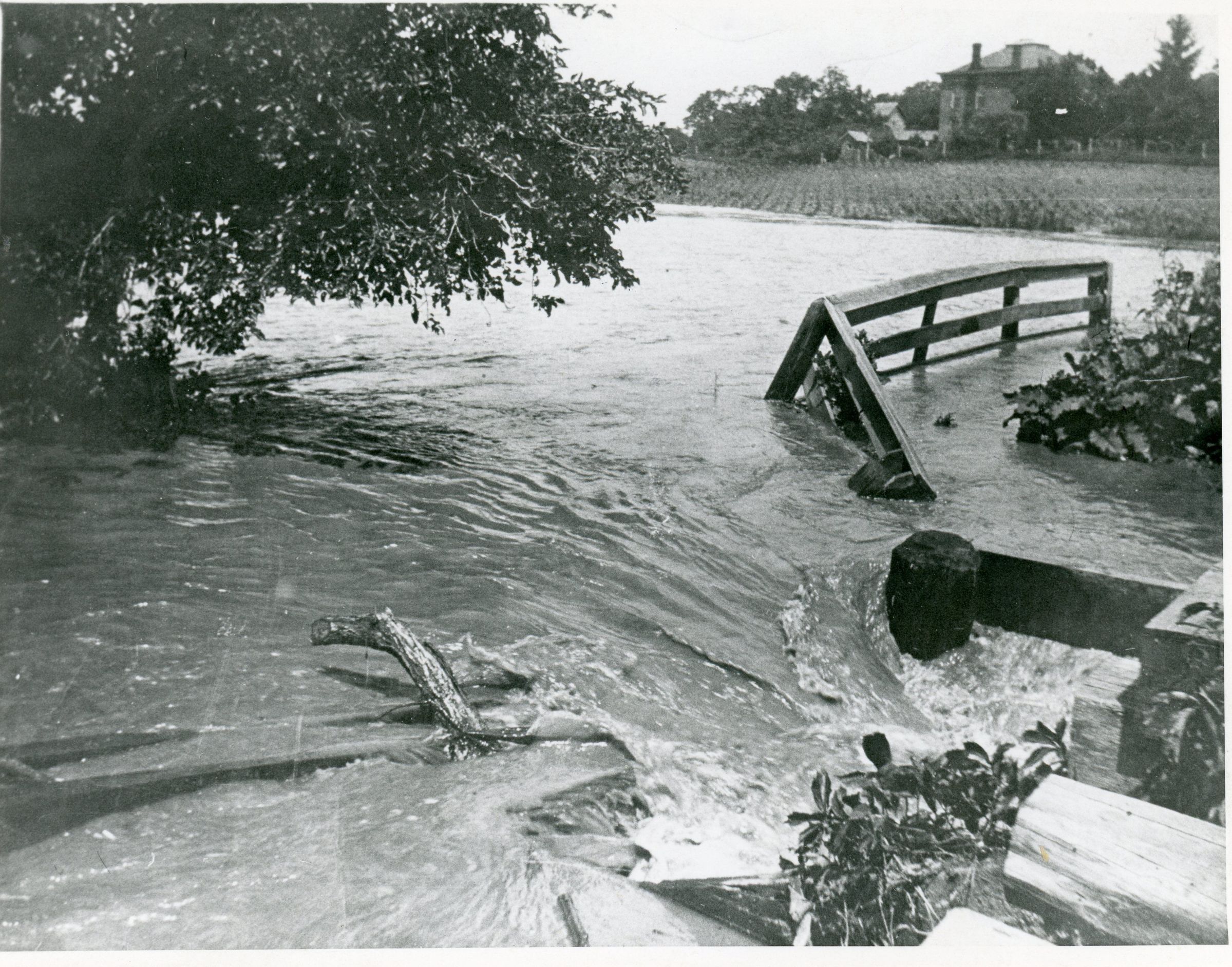 Rouge River Flood at Wayne Road Bridge. Balus House at Ash and Wayne Road in top right.